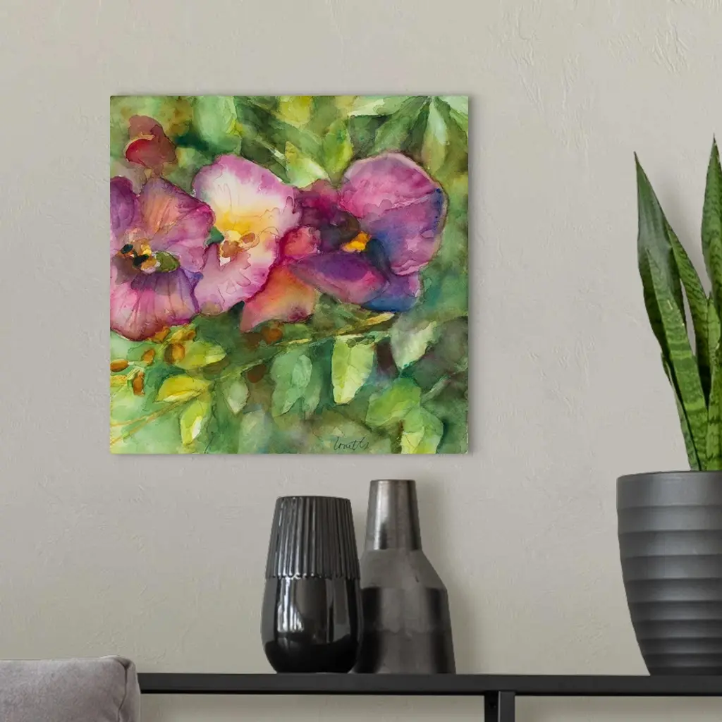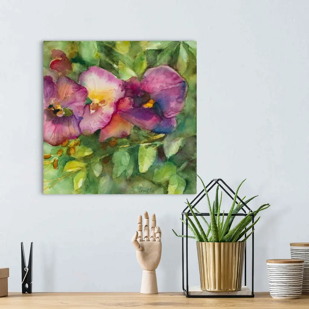 Delicate orchids are a striking contrast to the greenery they rest upon.