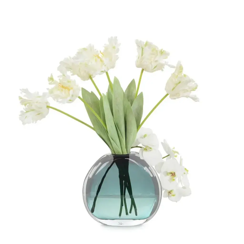 6"H X 38"W X 7"D A long glass cube with natural green bamboo covered with faux water and white dendrobiums.