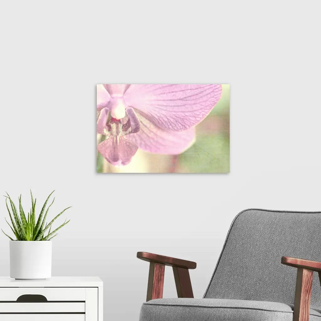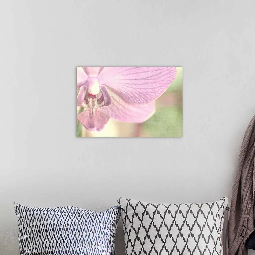 Big, horizontal , fine art, close up photograph of a partial orchid on a soft focus background. The entire image has a vintage tone with very small lines in various directions.