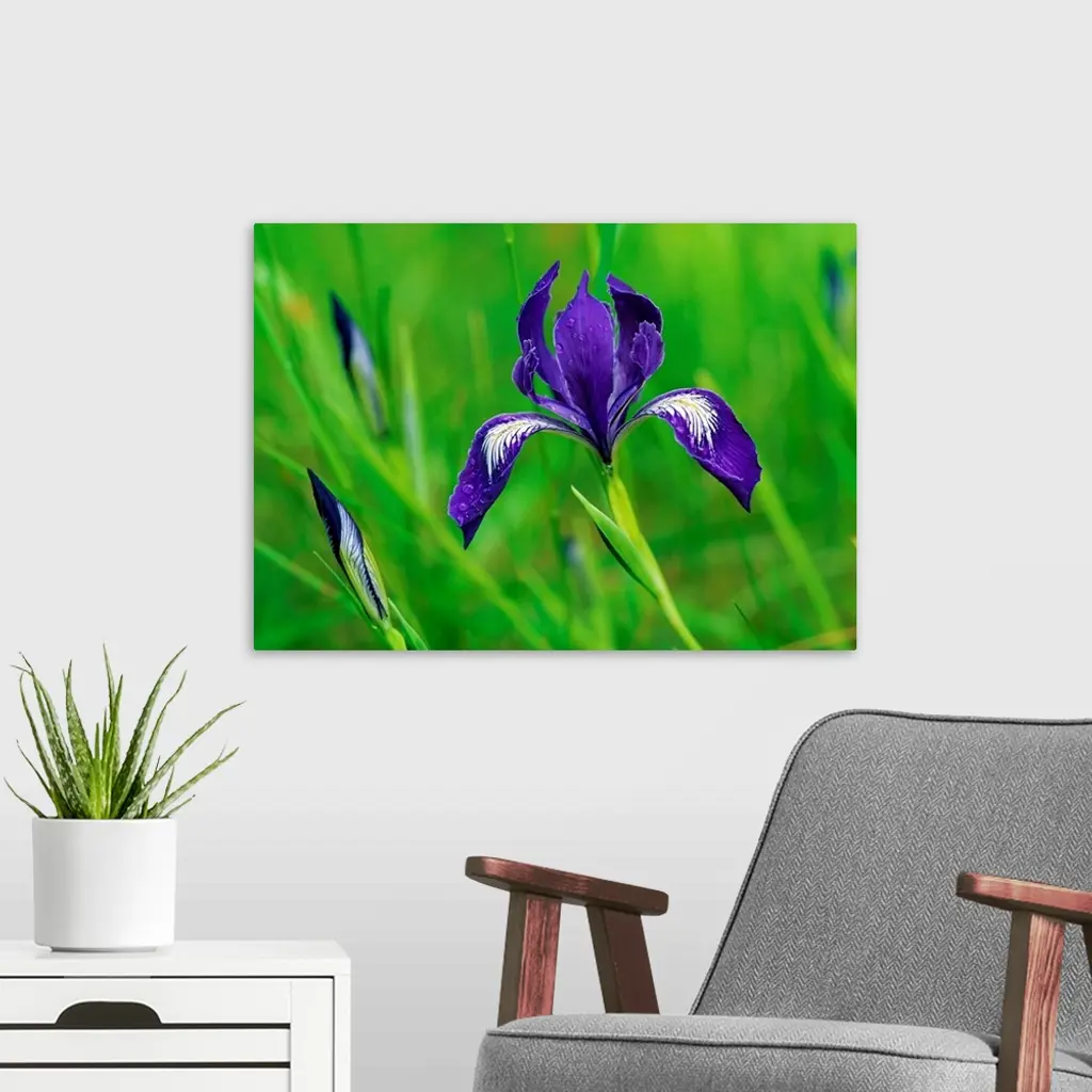 Horizontal, close up photograph of a blooming iris surrounded by several buds and long grasses in Oregon.