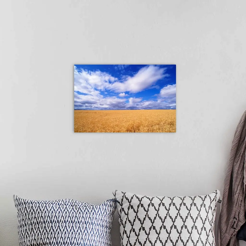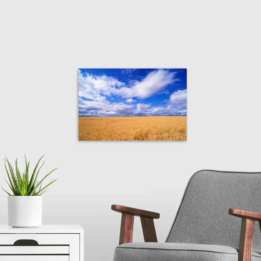 Oregon, View Of Large Wheat Field Against A Blue Sky With Large White Clouds wall art for home and office decor. Discover canvas art prints, photos, mural, big canvas art and framed wall art in GreatBigCanvas.com's varied collections.