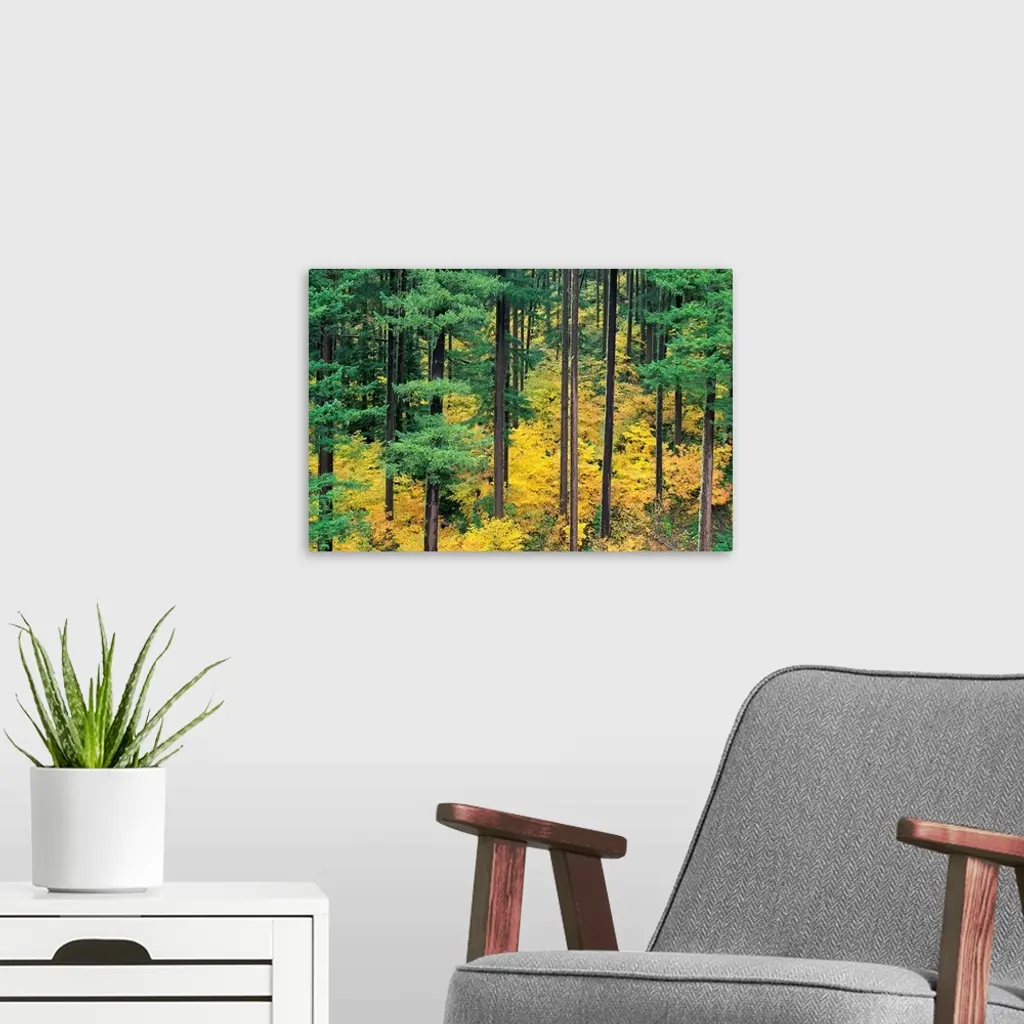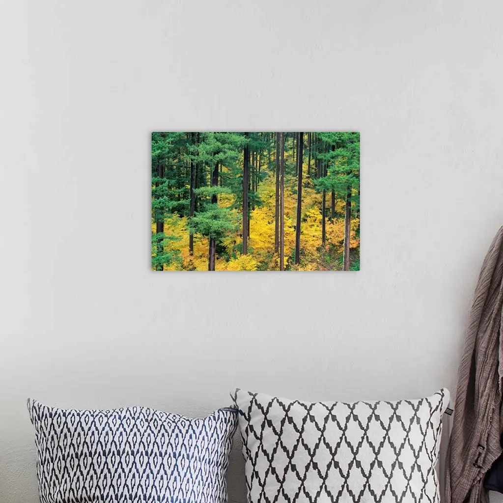 Oregon, Willamette National Forest, Vine Maple And Douglas Fir Trees In Fall wall art for home and office decor. Discover canvas art prints, photos, mural, big canvas art and framed wall art in GreatBigCanvas.com's varied collections.