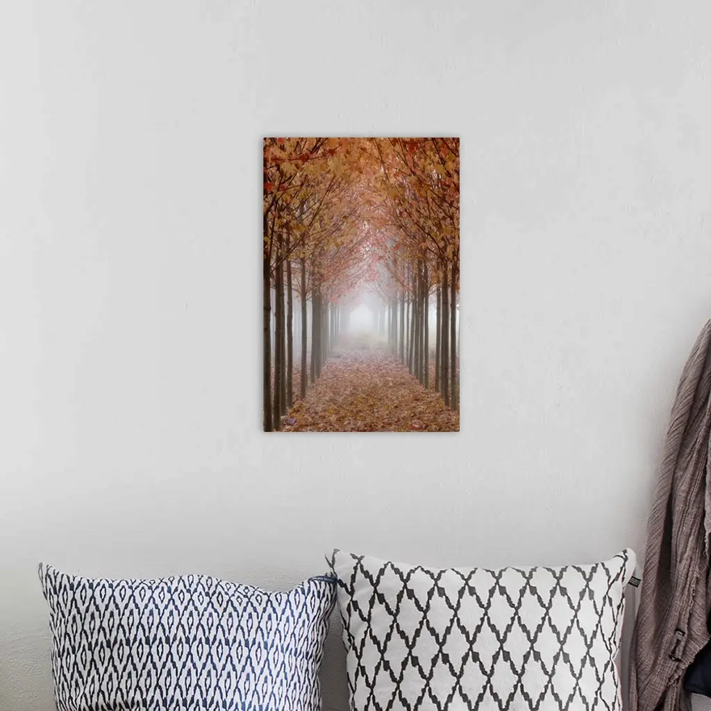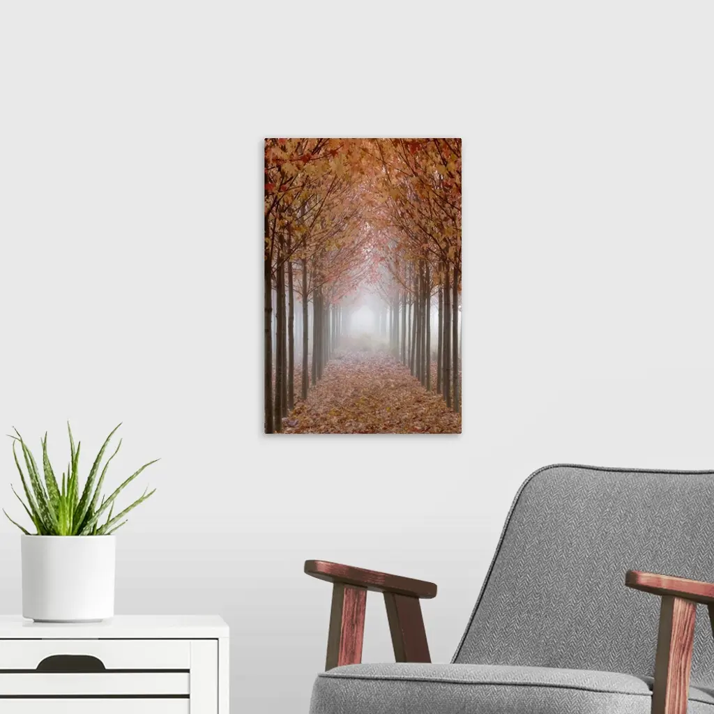 Oregon, Willamette Valley. Rows Of Autumn-Colored Maple Trees Form Pathway In Fog