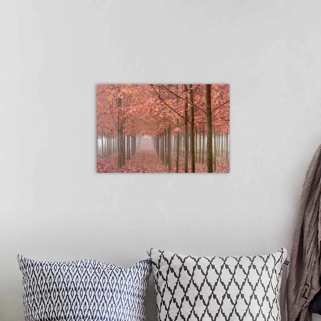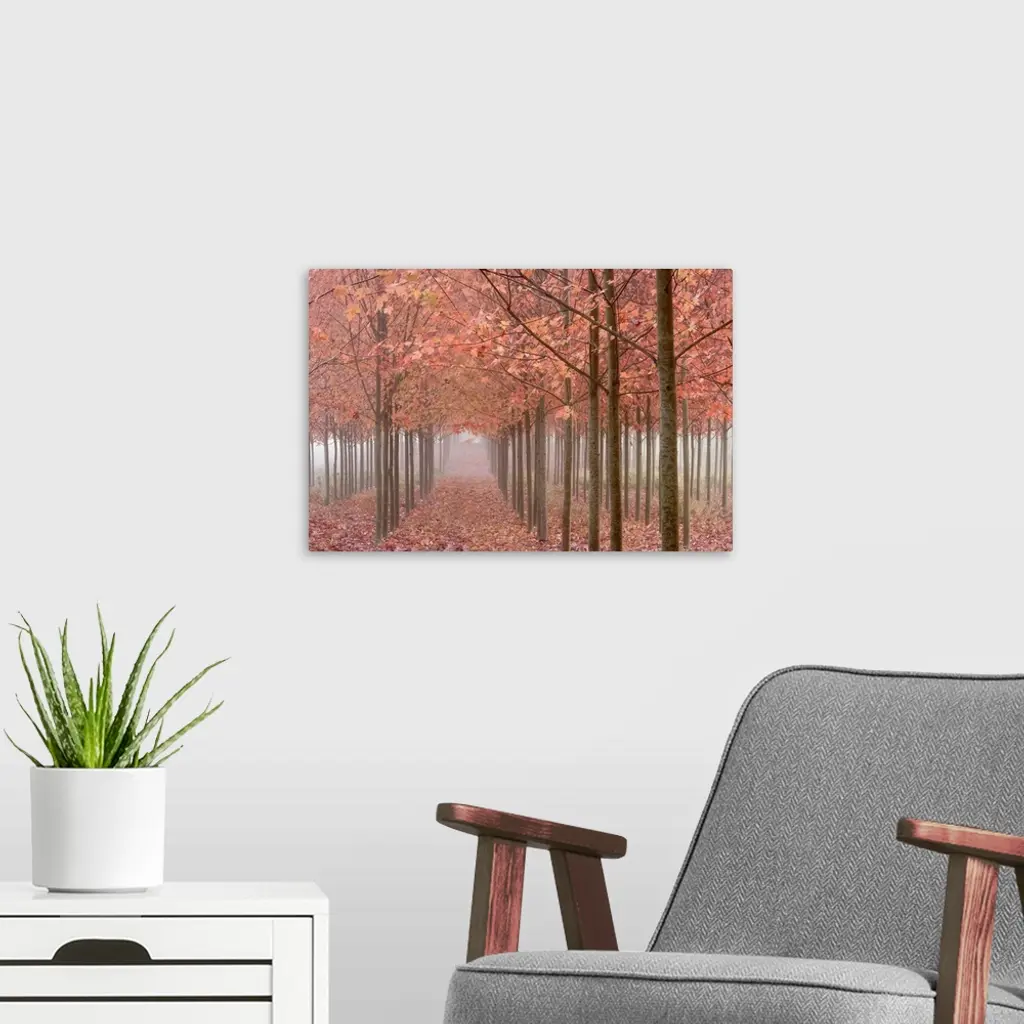 Oregon, Willamette Valley. Rows Of Autumn-Colored Maple Trees In Fog