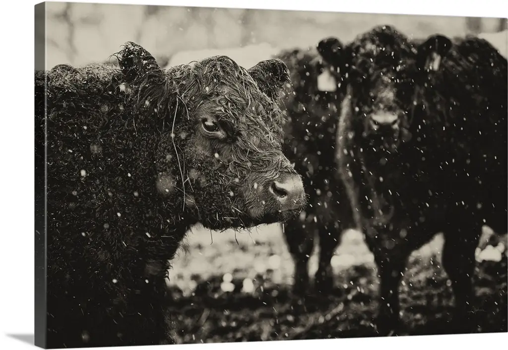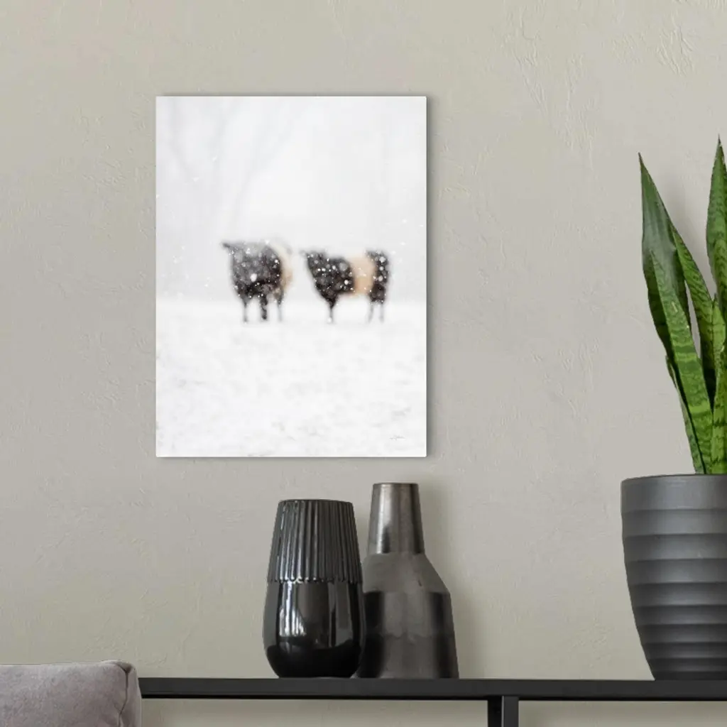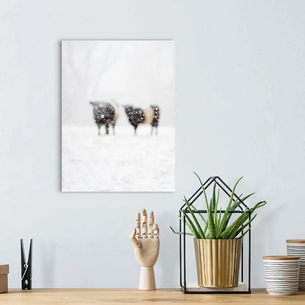 Artistic photograph of two cows standing in a snowy field with prominent blurring throughout.