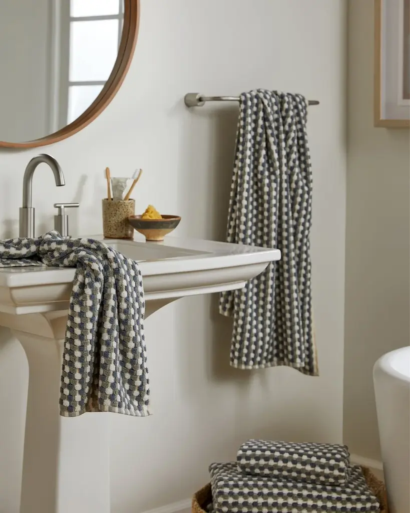 Inspired by hand-woven Turkish towels, this fashion-forward staple has a retro vibe. Made from organic cotton, its gentle-yet-durable weave features a stunning jacquard pattern. Mix and match with our existing towel assortment to highlight the ochre, clay and white hues or style solo in a statementbath.