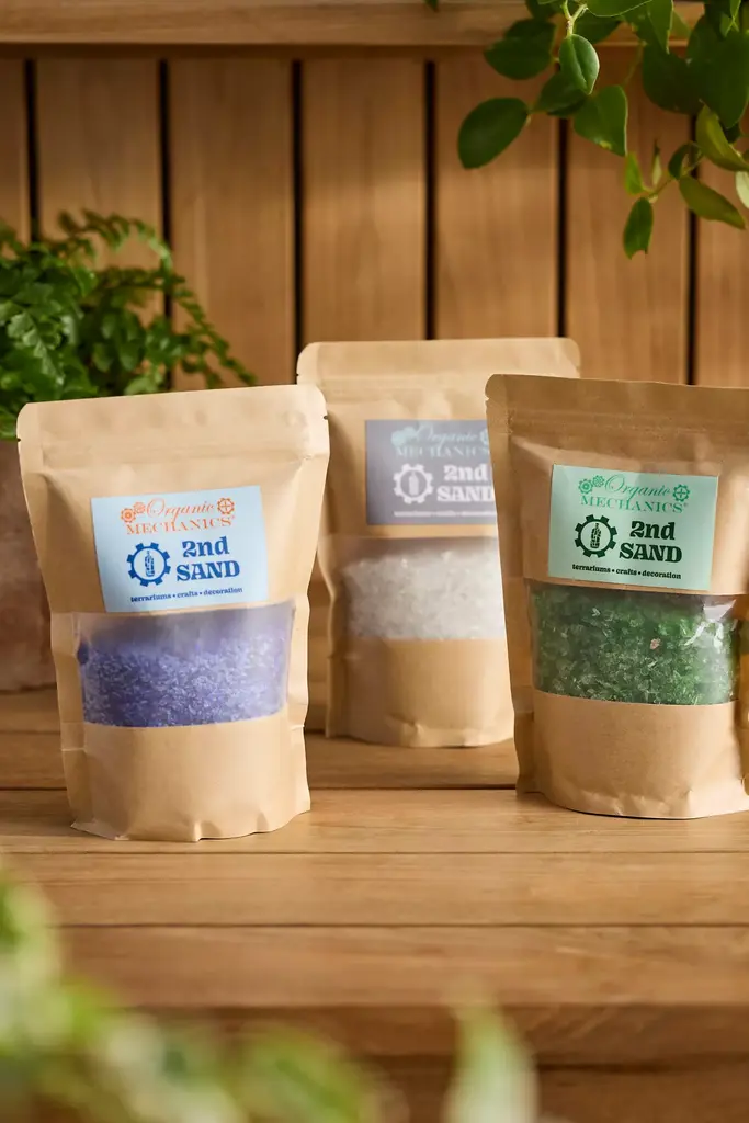 Create vibrant terrariums, top off potted plants, or even design your own unique work of art with this recycled glass sand.