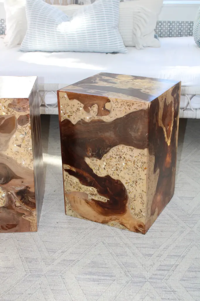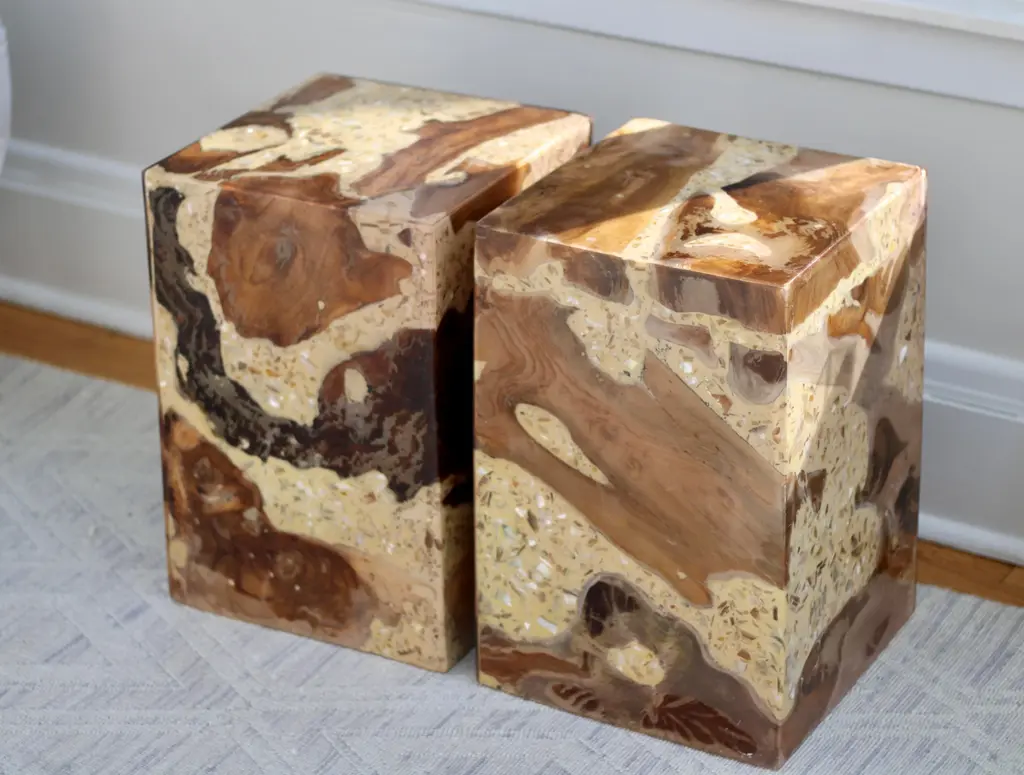Modern organic teak cube and resin lacquered table with beautiful terrazzo ‘swirls’ between the teak wood forms. These are new tables with a lovely vintage appeal. The terrazzo swirls offer a great sense of movement within the piece. Available as a pair or a single.