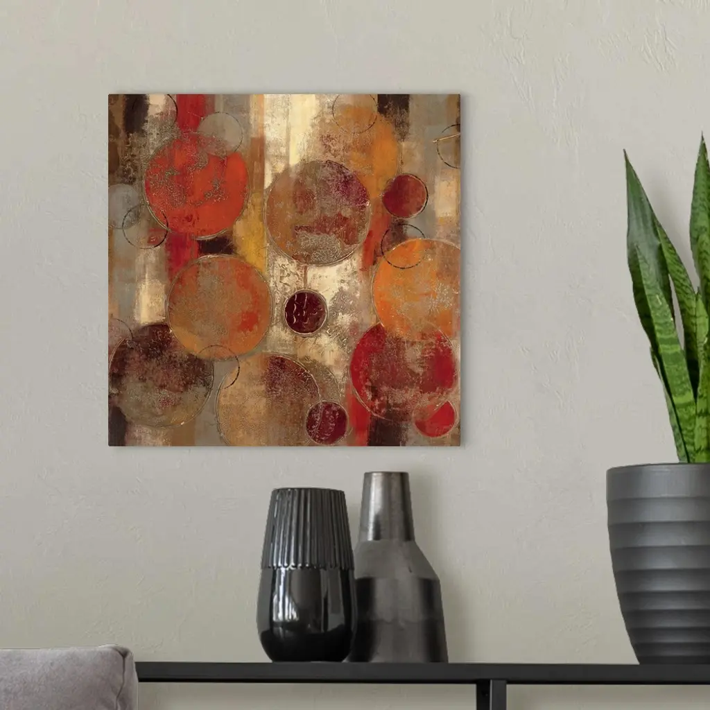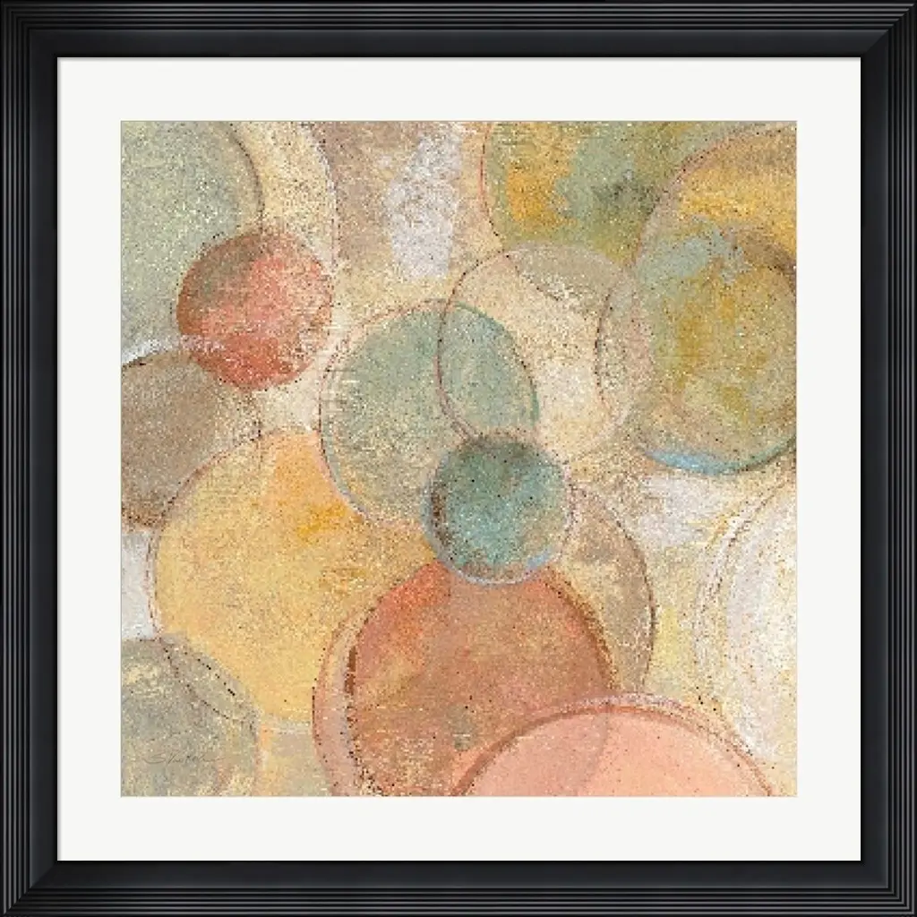 An abstract piece of art that has muted colors that run vertically in thick stripes with larger and smaller circles of the same colors placed over them.