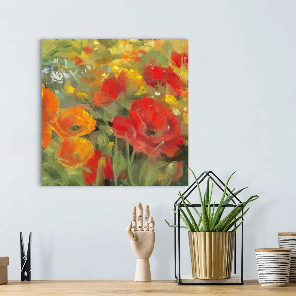 Big contemporary floral art shows a field of colorful oriental poppy flowers against a slightly rough texture covering the canvas.