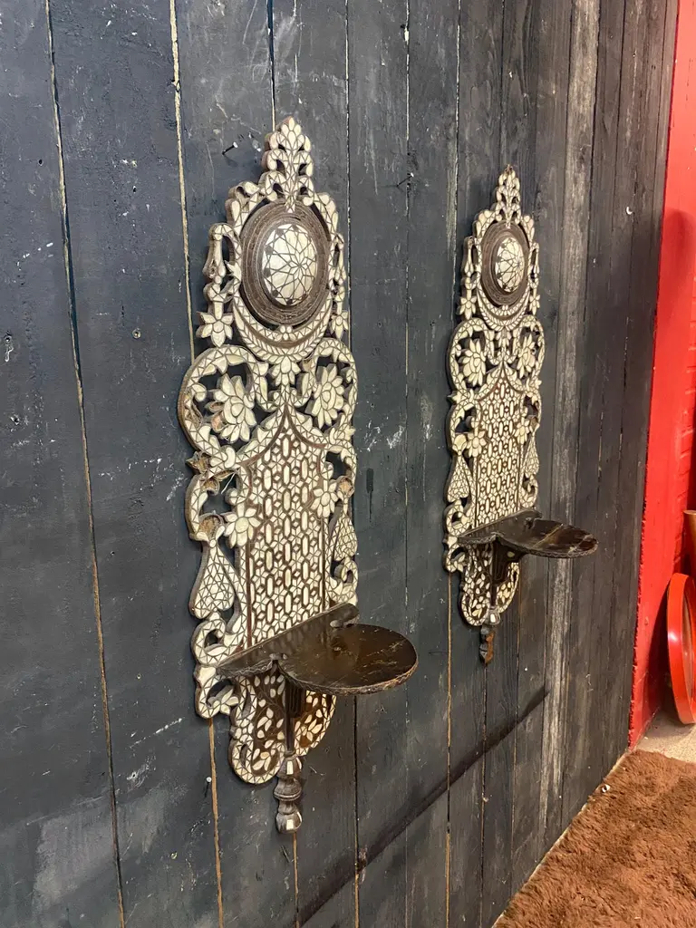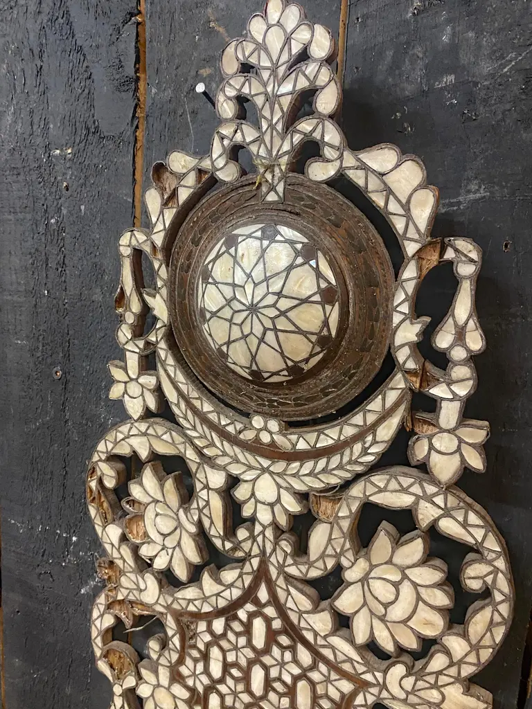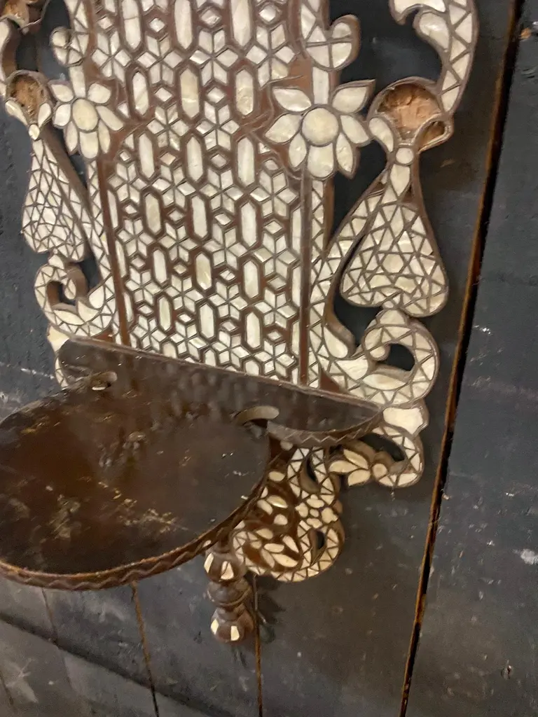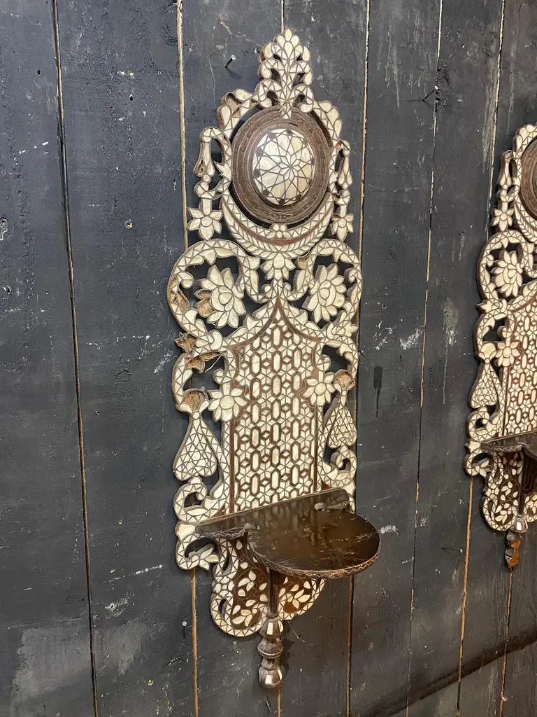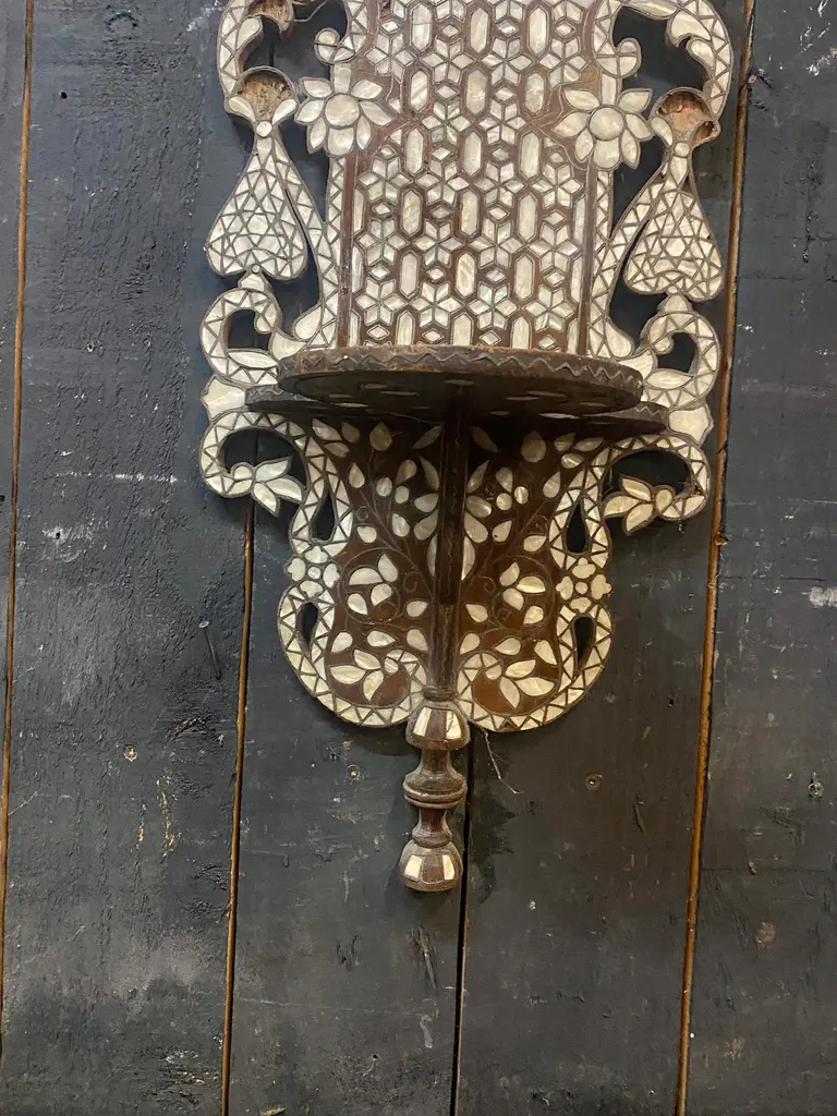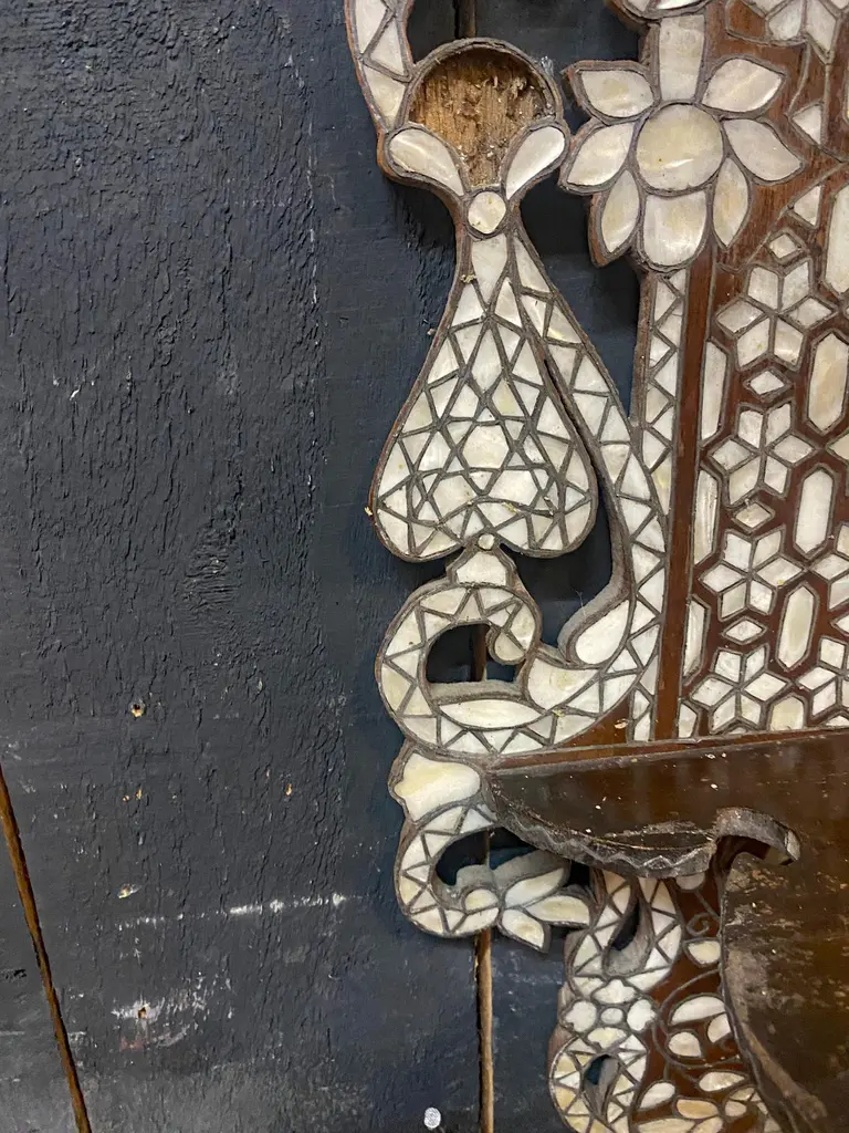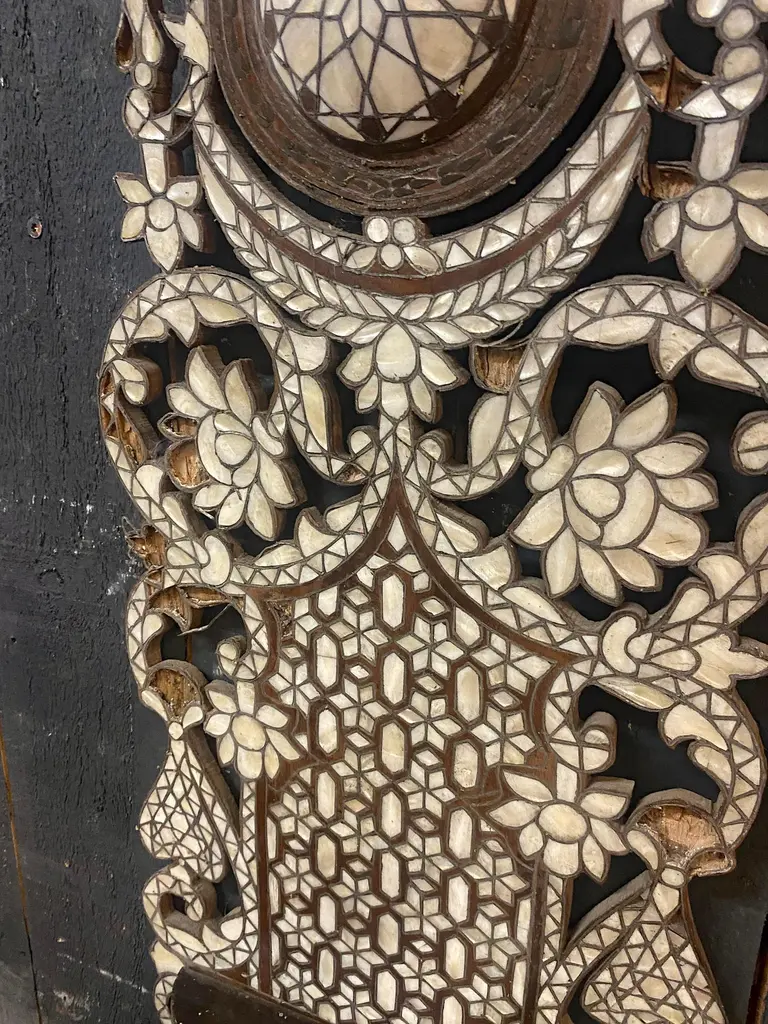 Oriental work from the 19th century, 2 large shelves in carved wood and bone marquetry.missing bones price is for onetwo are available
