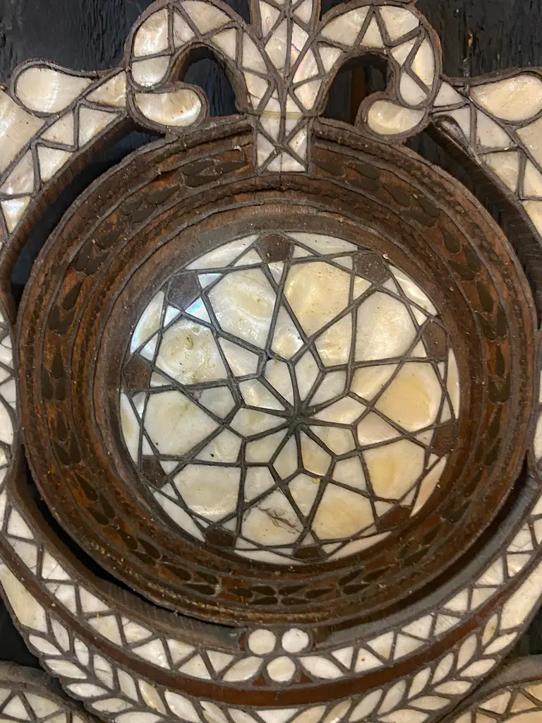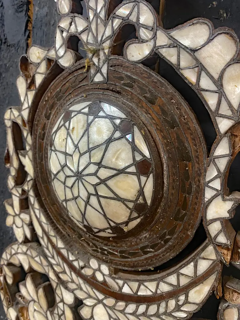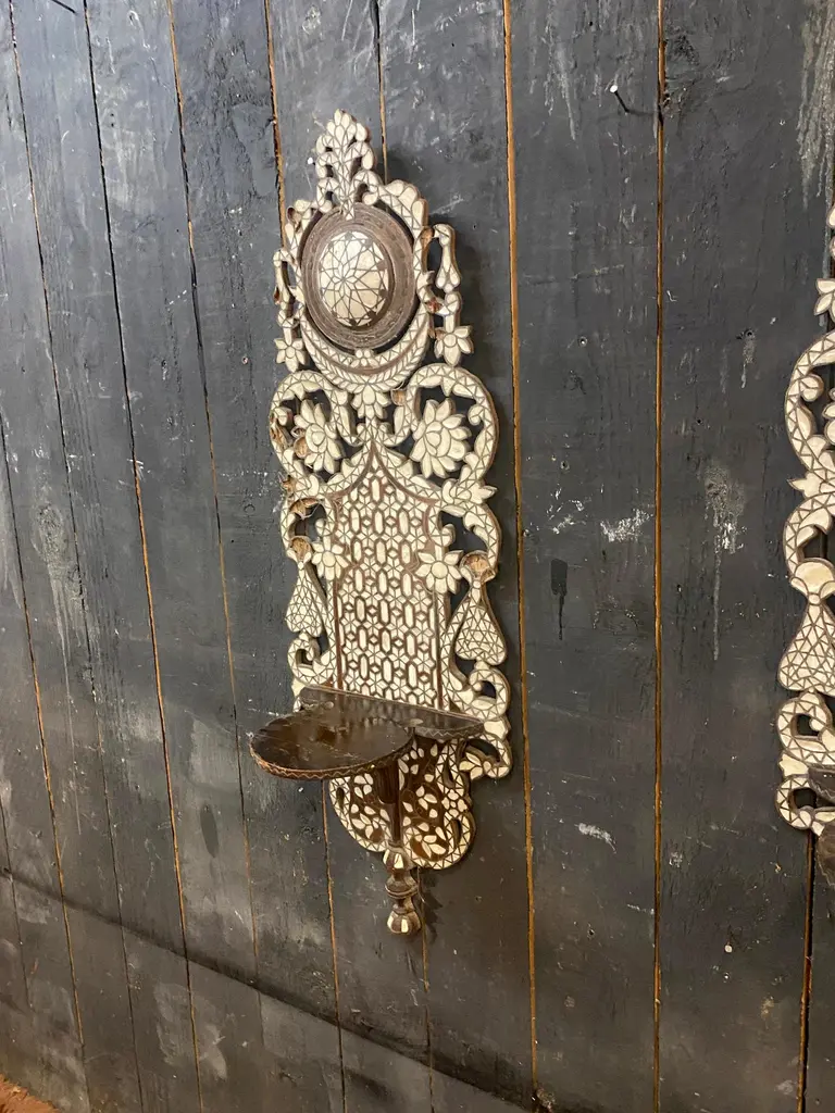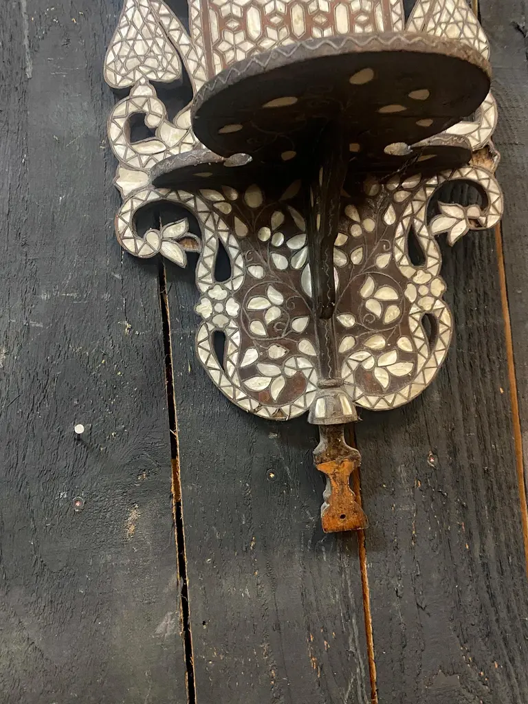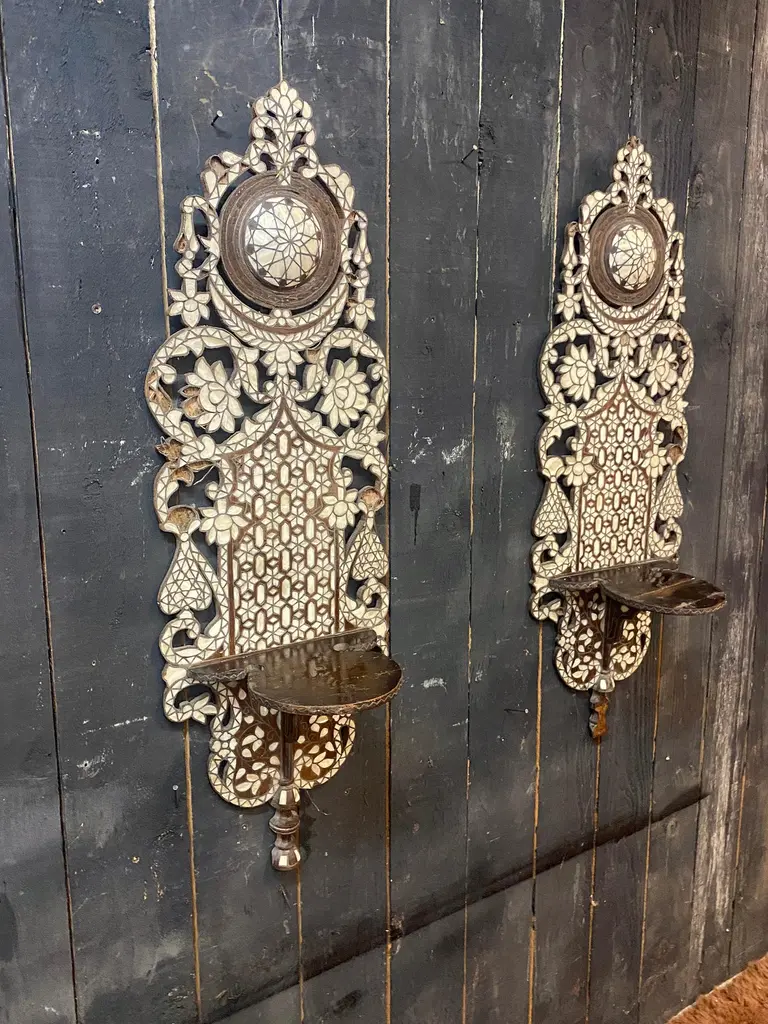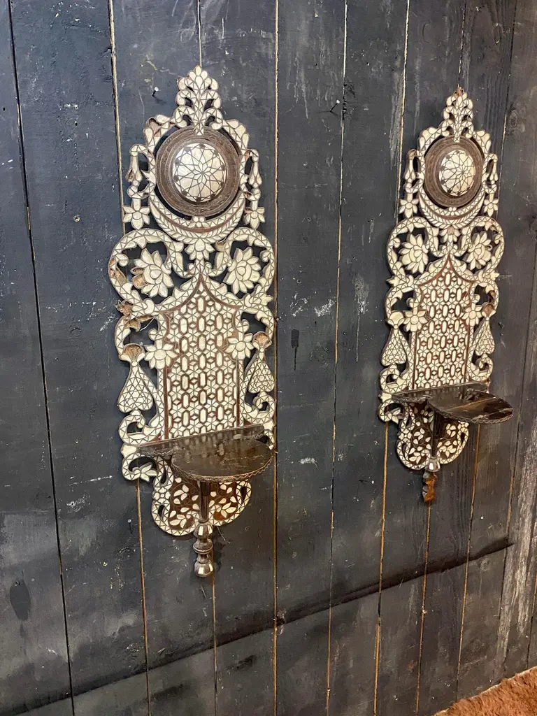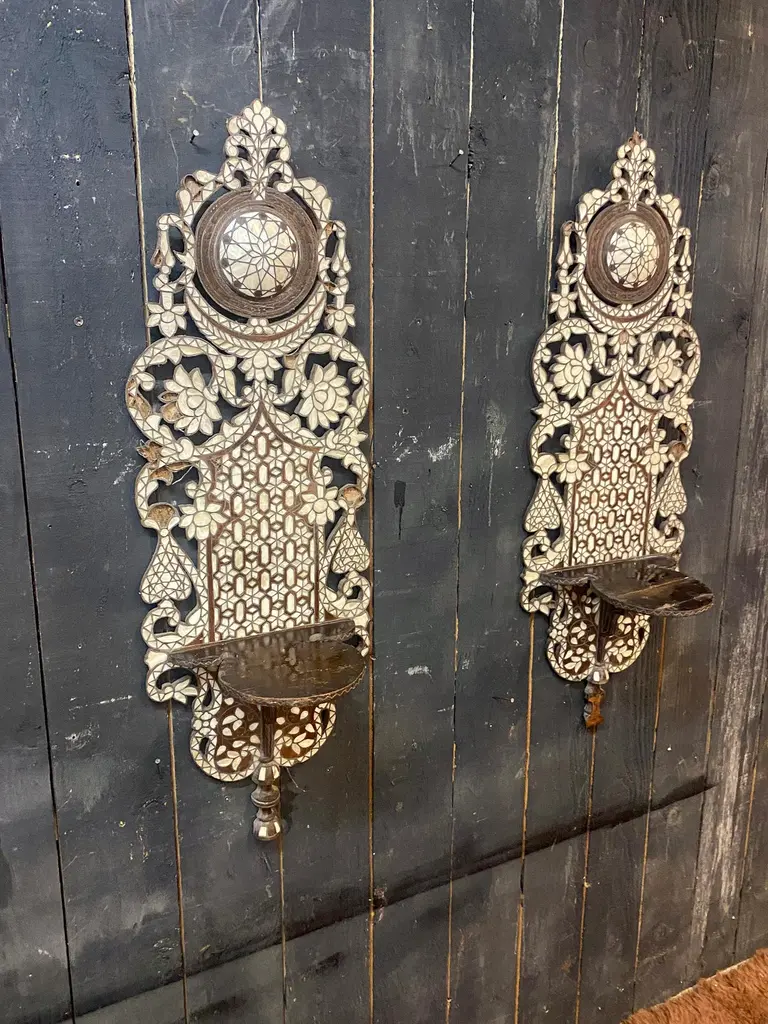 Oriental work from the 19th century, 2 large shelves in carved wood and bone marquetry.missing bones price is for onetwo are available