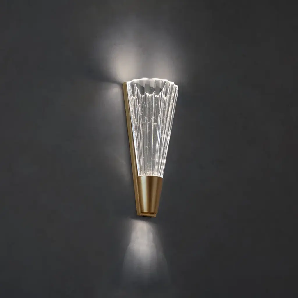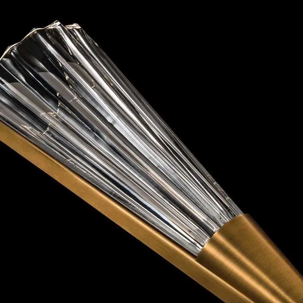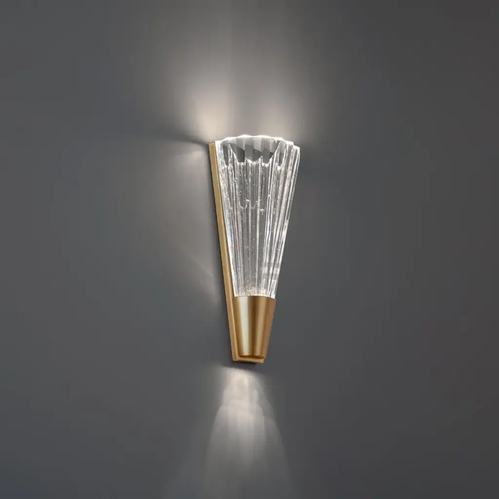 Calming and prescient, Origami proffers a simple elegance. Folds in the patterned Schonbek hand-cut crystal glass shade illuminate as prisms to bend light. Integral LEDs discreetly offer generous indirect illumination from behind a reflector plate finished in luxury.