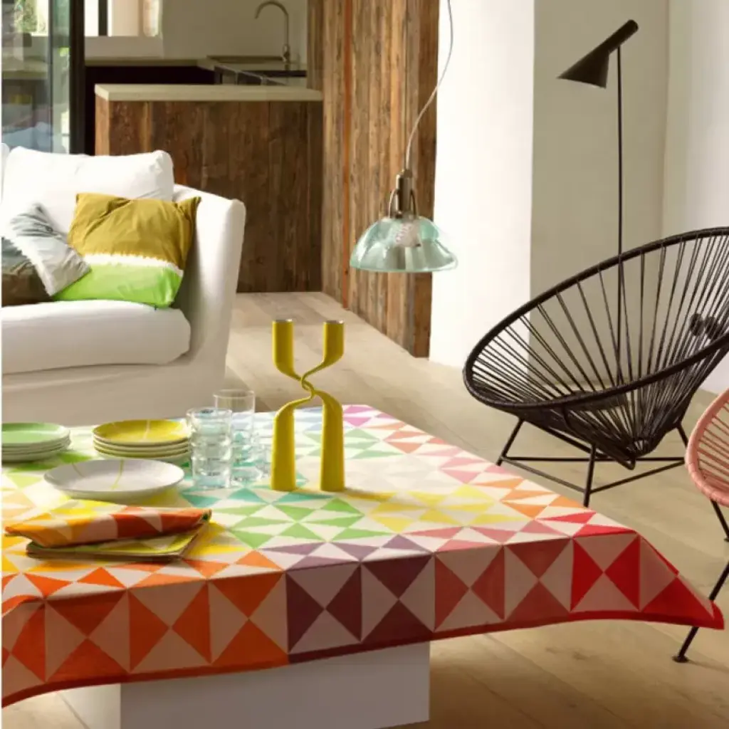 This reversible multicolor design, with its undeniable contemporary, graphic appeal, could never be accused of having melancholy hues! Its on-trend pattern features bright, sparkling shades. Since 1888, Le Jacquard Francais has created a collection of table linens without equal. Weavers, warp beamers, knotters and other specialists work in harmony to perfect the weaves and colors of all of their linens. Classic Le Jacquard Francais linens are characterized by using framed woven patterns to create timeless tablecloths, napkins, placemats and table runners that will beautify your tables for many years. Le Jacquard Francais coated tablecloths are made of 100% cotton weave with long fibers. They are waterproof and stain-resistant thanks to a patented and exclusive acrylic coating that withstands washing. Newly introduced, LJF by Le Jacquard Francais is a more casual line of contemporary looks that mixes colors and patterns and plays with graphics. Practical and easy to use, these tablecloths will stand up to frequent use in the kitchen or patio.