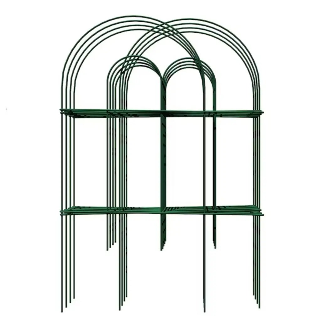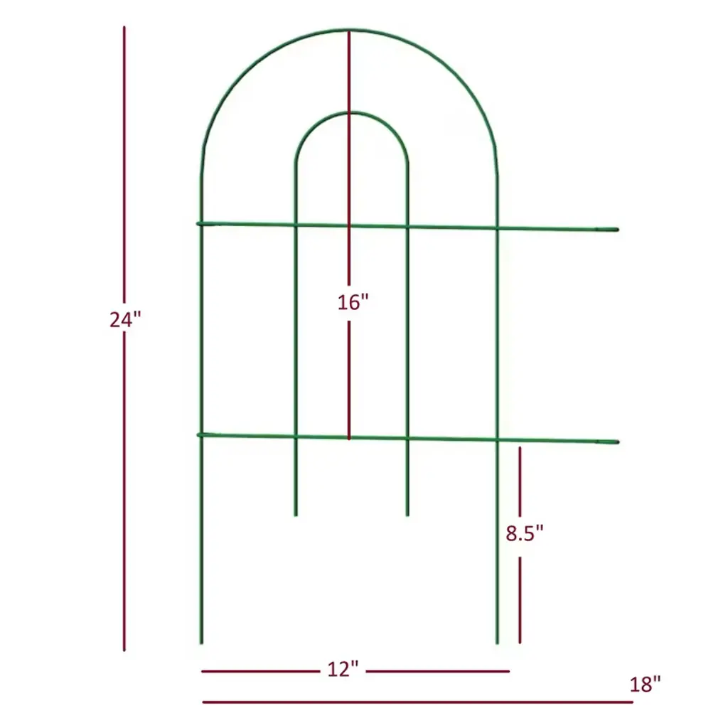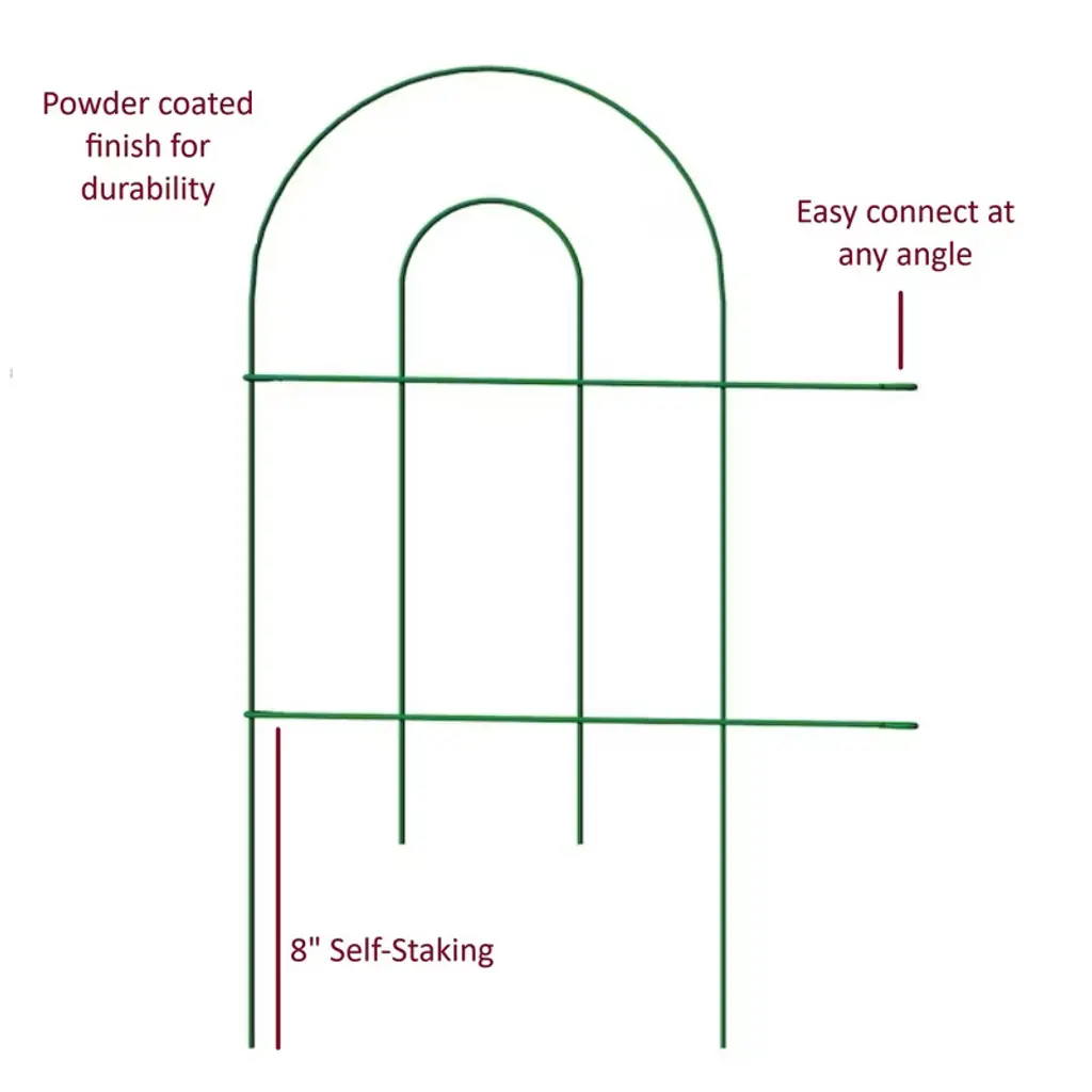 Folds neatly for space-saving storage. Attractive green color blends in nicely with surroundings. Maintain healthy, protected plant and flower beds with the Round Folding Fence from Origin Point Garden Craft. These simple but attractive garden borders are self-staking and have spiked feet for sturdy installation and reliable support. Because they go into the ground easily, they are simple to set-up and arrange to best suits your needs. In addition to marking garden boundaries, they make great borders for patio walks, driveways, and garden paths. The lightweight metal is coated in heavy-duty green PVC, protecting it from rust, fading, and wear caused by the elements, and these fence pieces fold up neatly for simple, space-saving storage.
