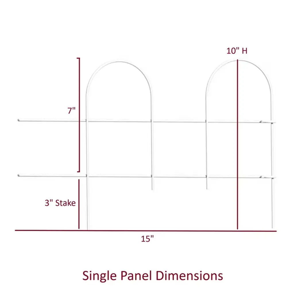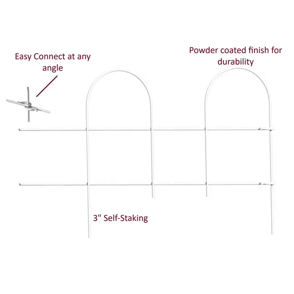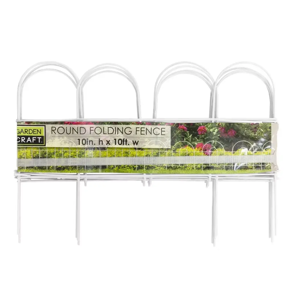 Lightweight in design and easily bends to allow for curved lines and angles. Durable poly-coated finish helps prevent rust and corrosion and extends life of the garden border. Folds flat for easy storage. This 10” lightweight and easy to install white round folding fence suits a wide variety of landscaping and gardening projects. Provides a nice and attractive decorative element to yards, gardens and pathways while helping to prevent unwanted foot traffic. Self-supporting with spiked feet for sturdy installation. PVC coating resists weather damage for long-lasting use. Folds neatly for space-saving storage. Attractive all-white facade brightens any garden; measures 10 In. H x 10 ft L.