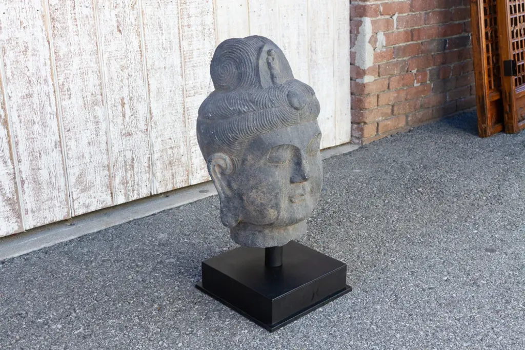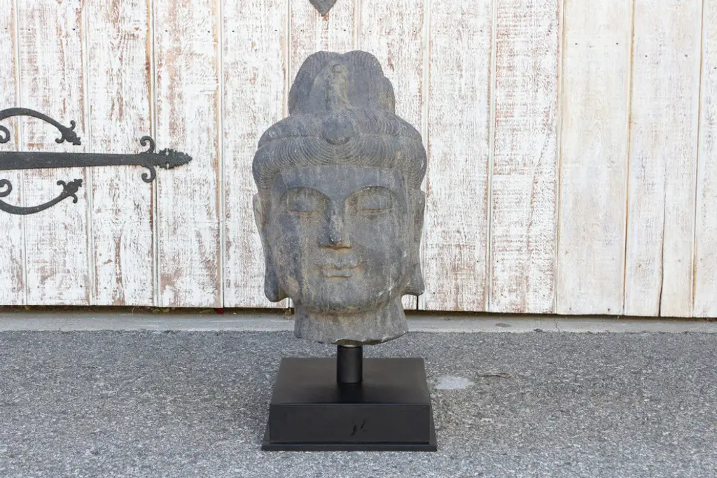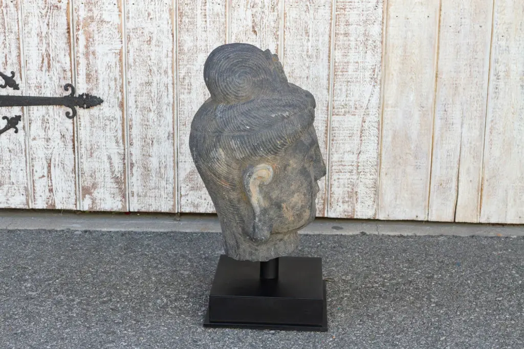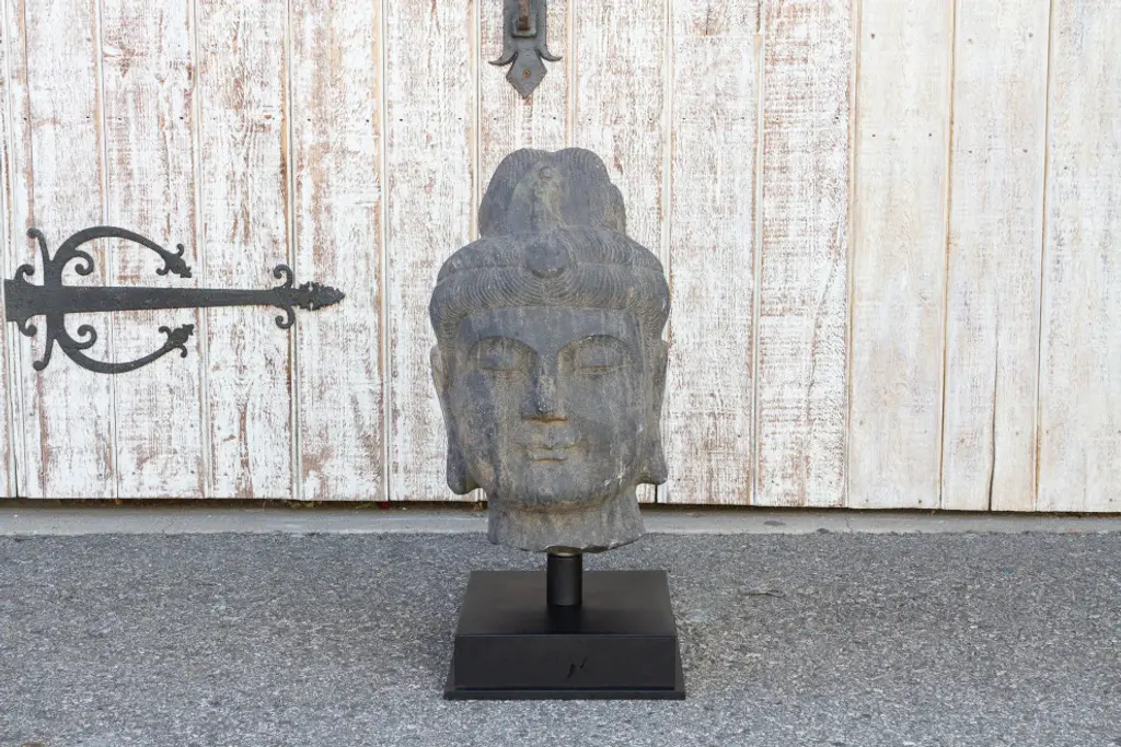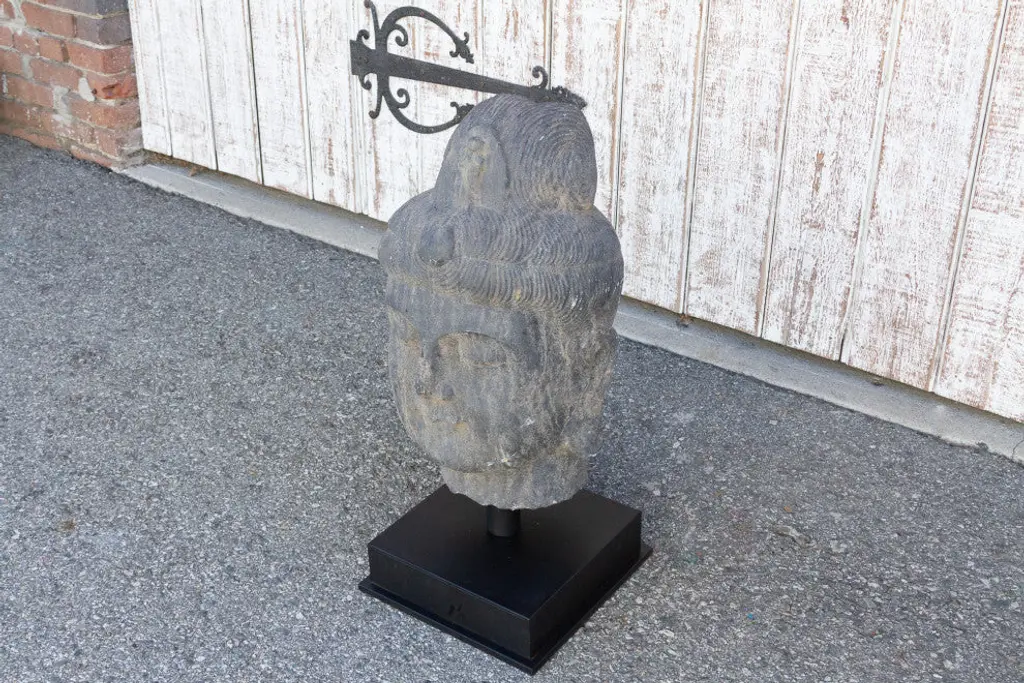 An antique stone statue of lovely proportions, this buddha head is hand-carved out of a single slab of stone. This Buddha statue shows delicate features and a serene expression. It sits on a custom iron stand. This statue is heavy and requires white glove delivery.