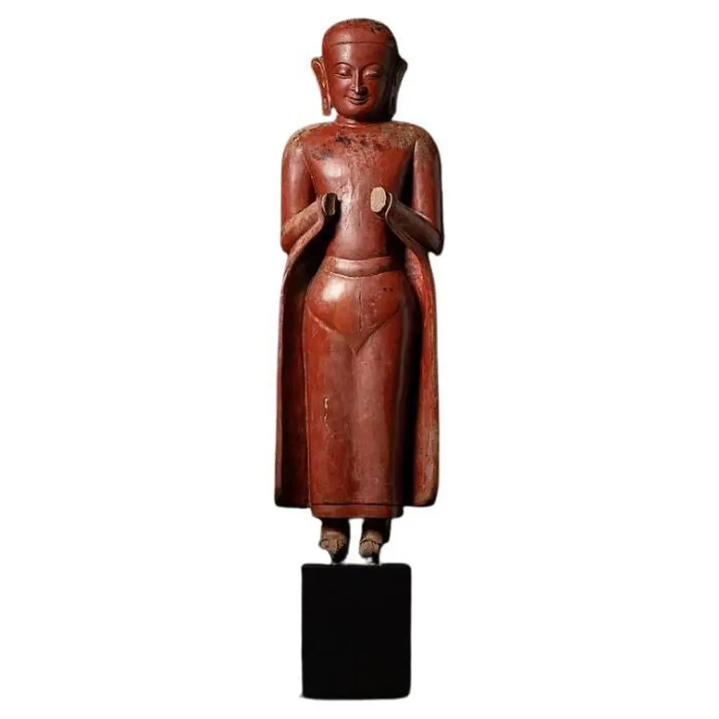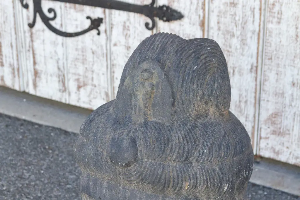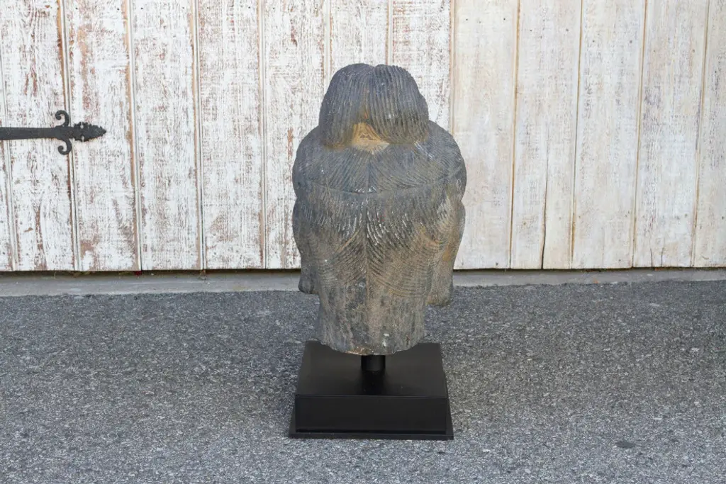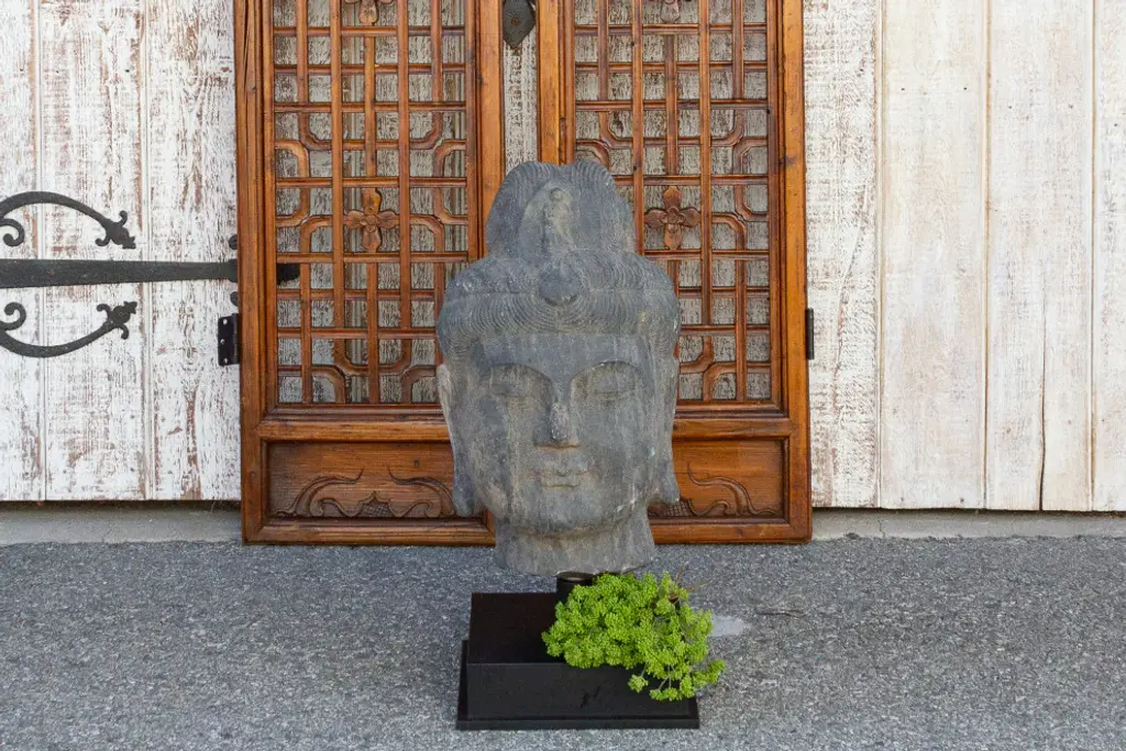 An antique stone statue of lovely proportions, this buddha head is hand-carved out of a single slab of stone. This Buddha statue shows delicate features and a serene expression. It sits on a custom iron stand. This statue is heavy and requires white glove delivery.