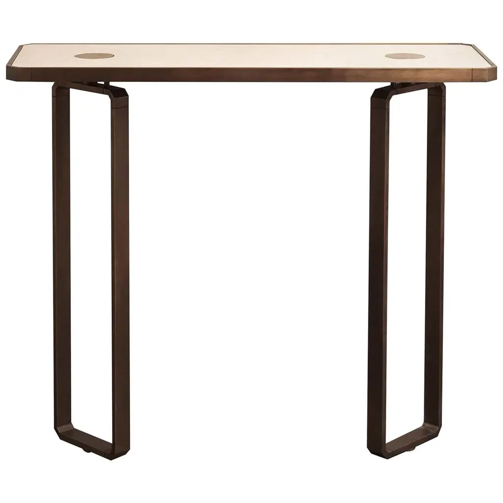 The Orizzonte console stands out for its neat design, marked by the reduced thickness of the top in Canaletto walnut ad the legs. The tubular structure - covered with corteccia brown leather - embraces the top in a very elegant way. Please contact the Concierge for other information.