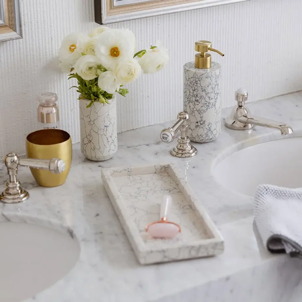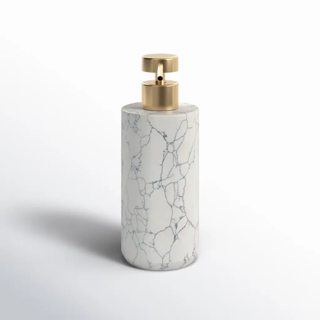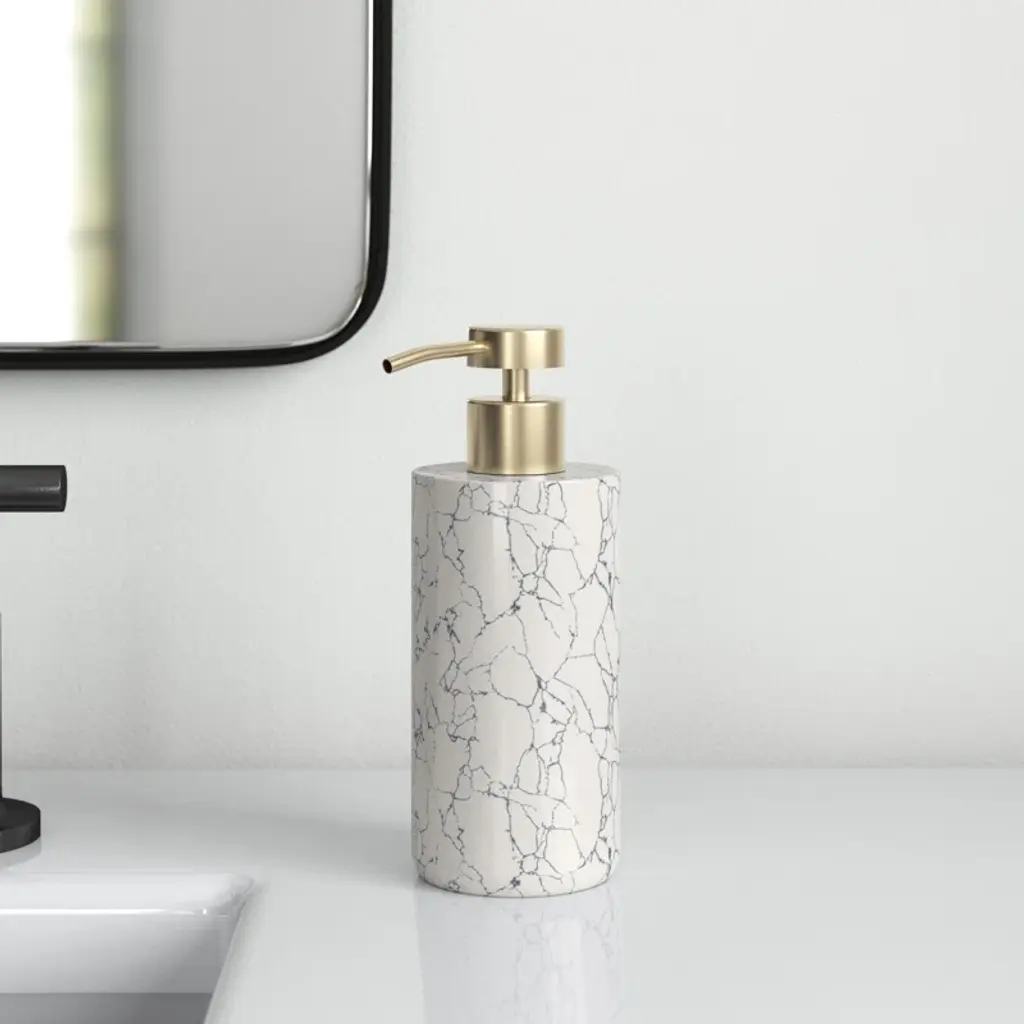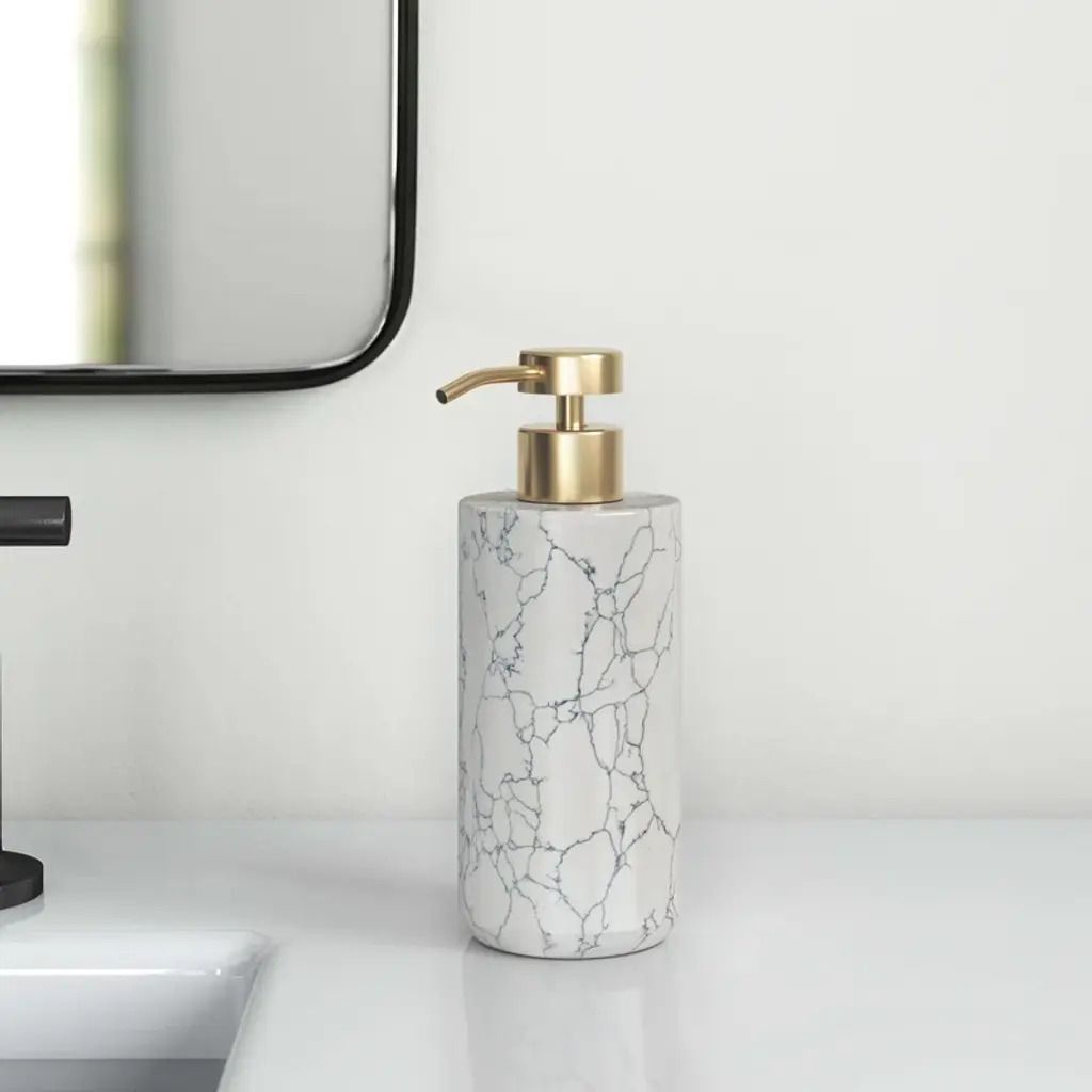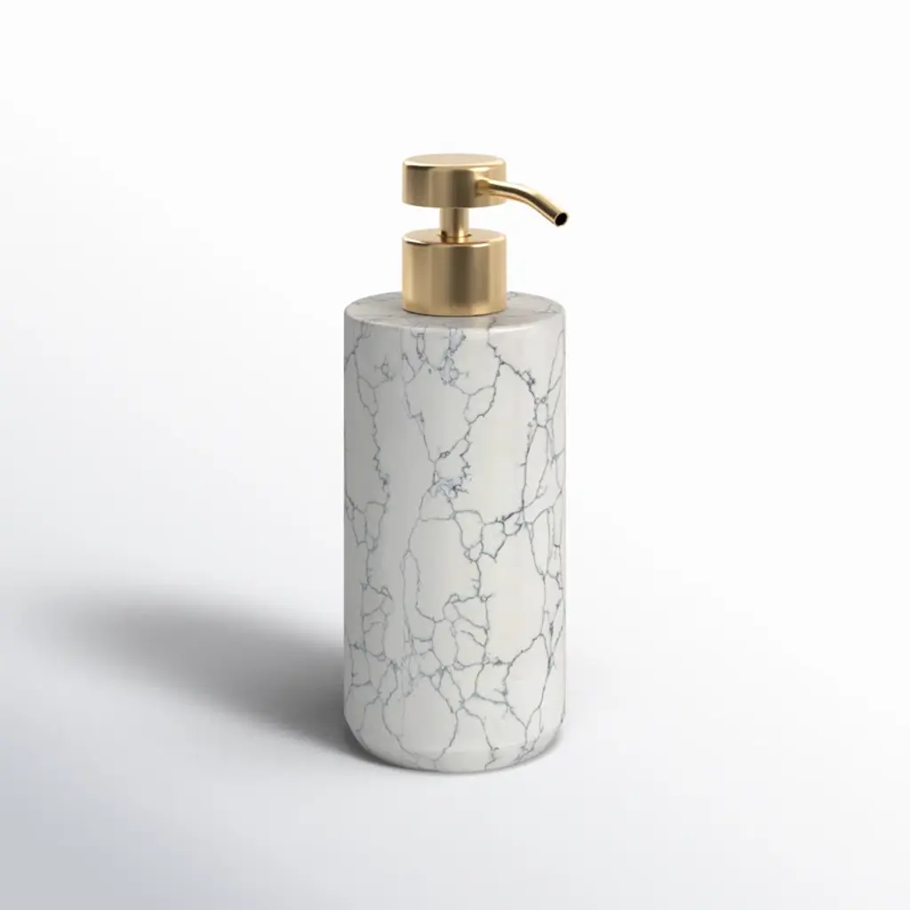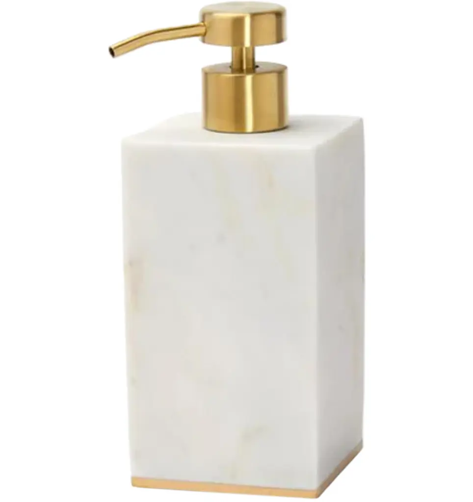 Add an effortlessly elevated accent to your bath or powder room with this freestanding soap dispenser. It's crafted from stone in a crisp white hue, and it features blue veining and a gold-colored pump for a glam look we love. This piece is just right for dosing out shampoo, conditioner, or lotion. Style it solo on your vanity or in pairs for a curated look in your shower.