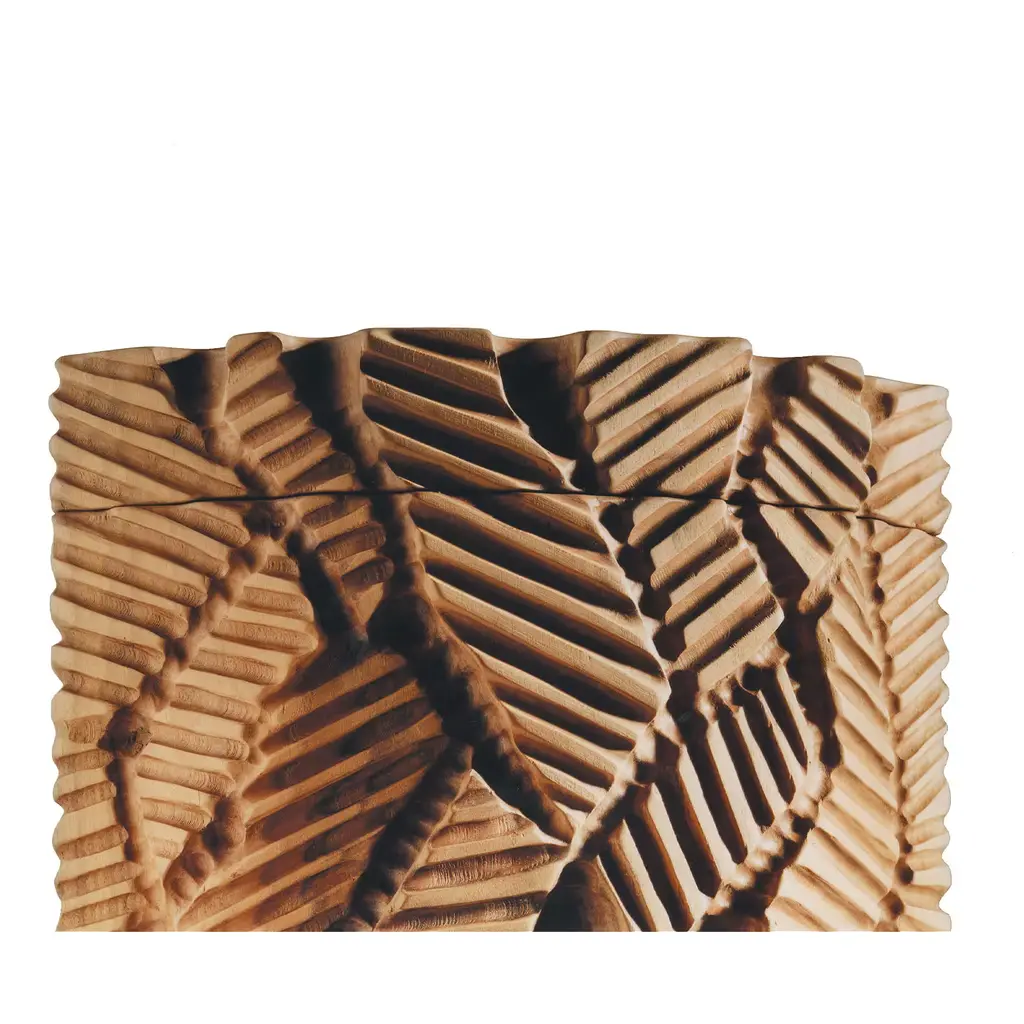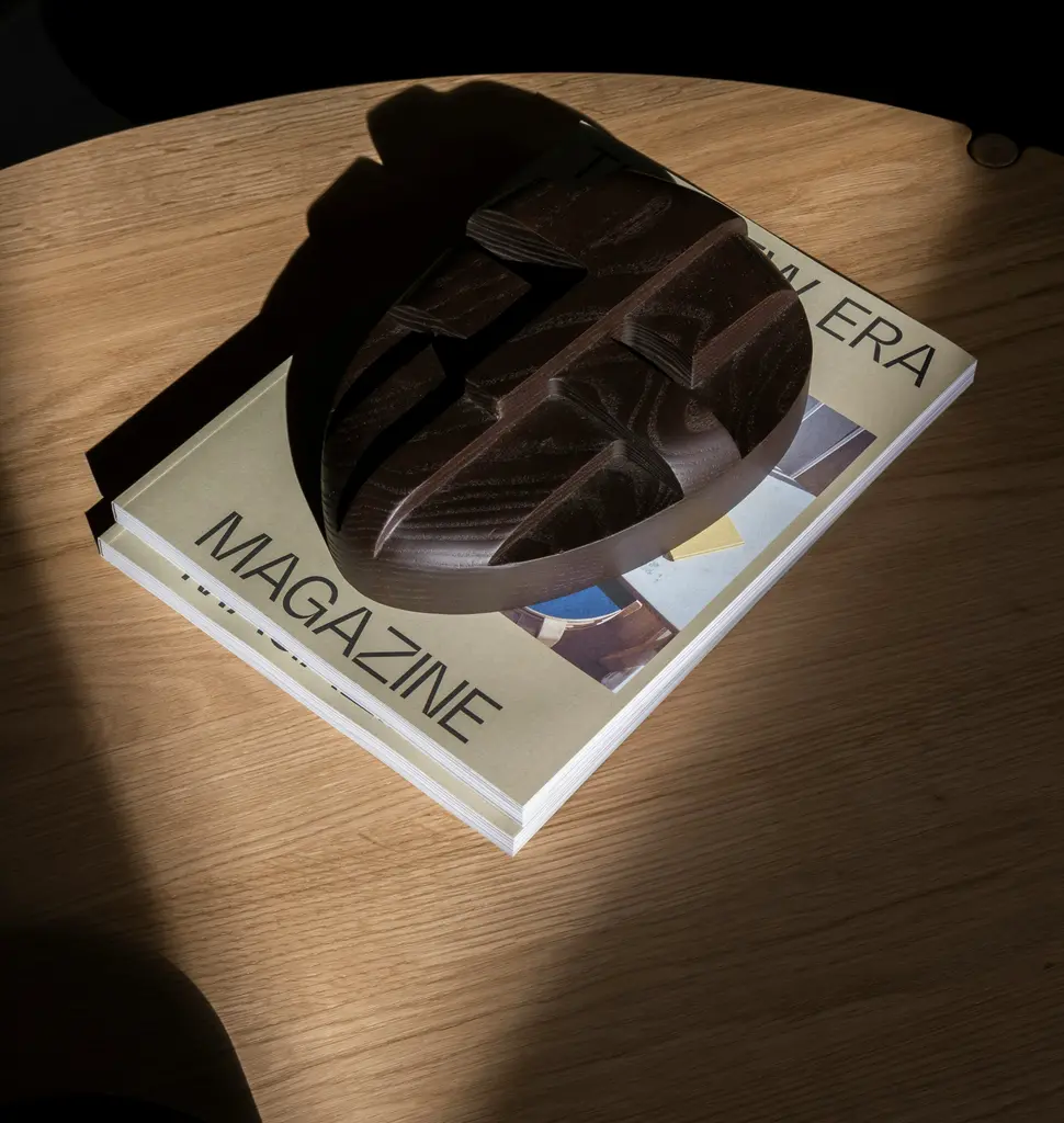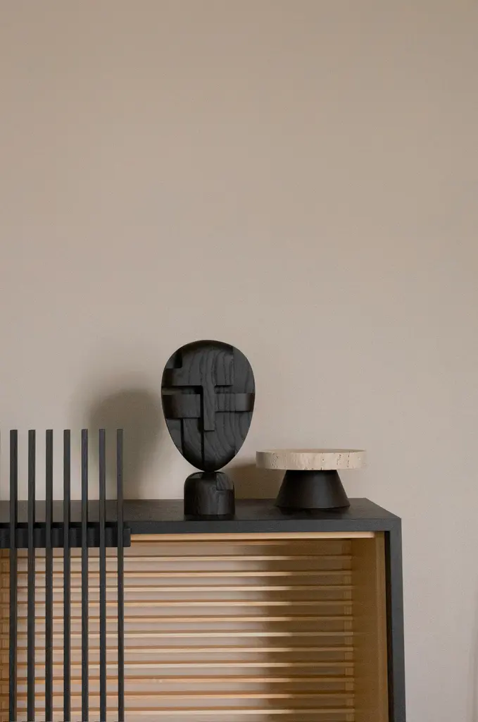 Named for a famous 1913 essay on modern design by architect Adolf Loos, Gabriel Tan's Ornament & Crime Sculpture is a beautifully hand-carved, modern interpretation of a traditional mask. Crafted from smoked ash, the sculpture can be hung on the wall, placed on a table, or displayed on a stand. Each handmade piece is unique and incorporates natural variations in the wood. Made in Portugal.