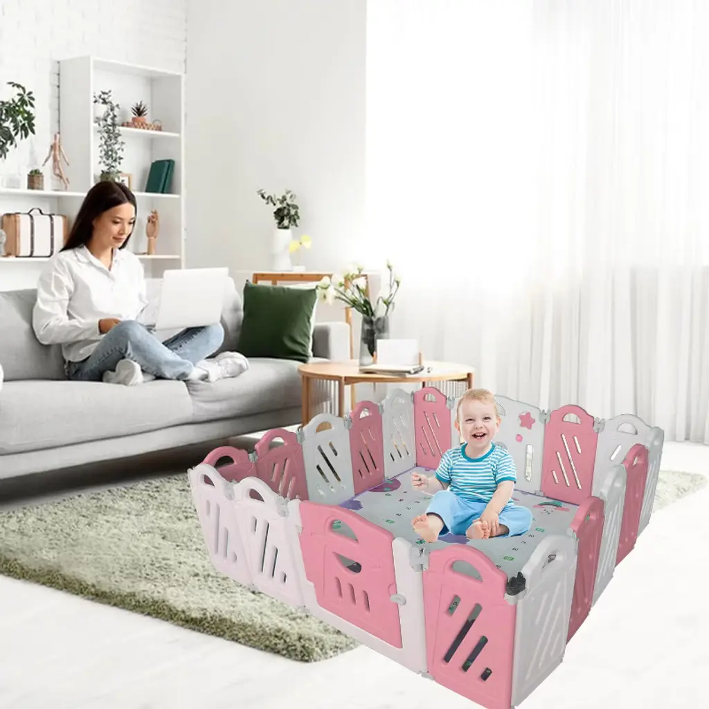This 16+2 panel baby playpen creates a safe play area for your little ones. Featuring an adjustable layout, safety lock gate, and foldable design for easy storage/transport. The sturdy yet soft panels provide a secure space for crawling and playtime. Perfect for homes, daycares, or travel. Made with non-toxic materials in a cute pink & white color scheme.