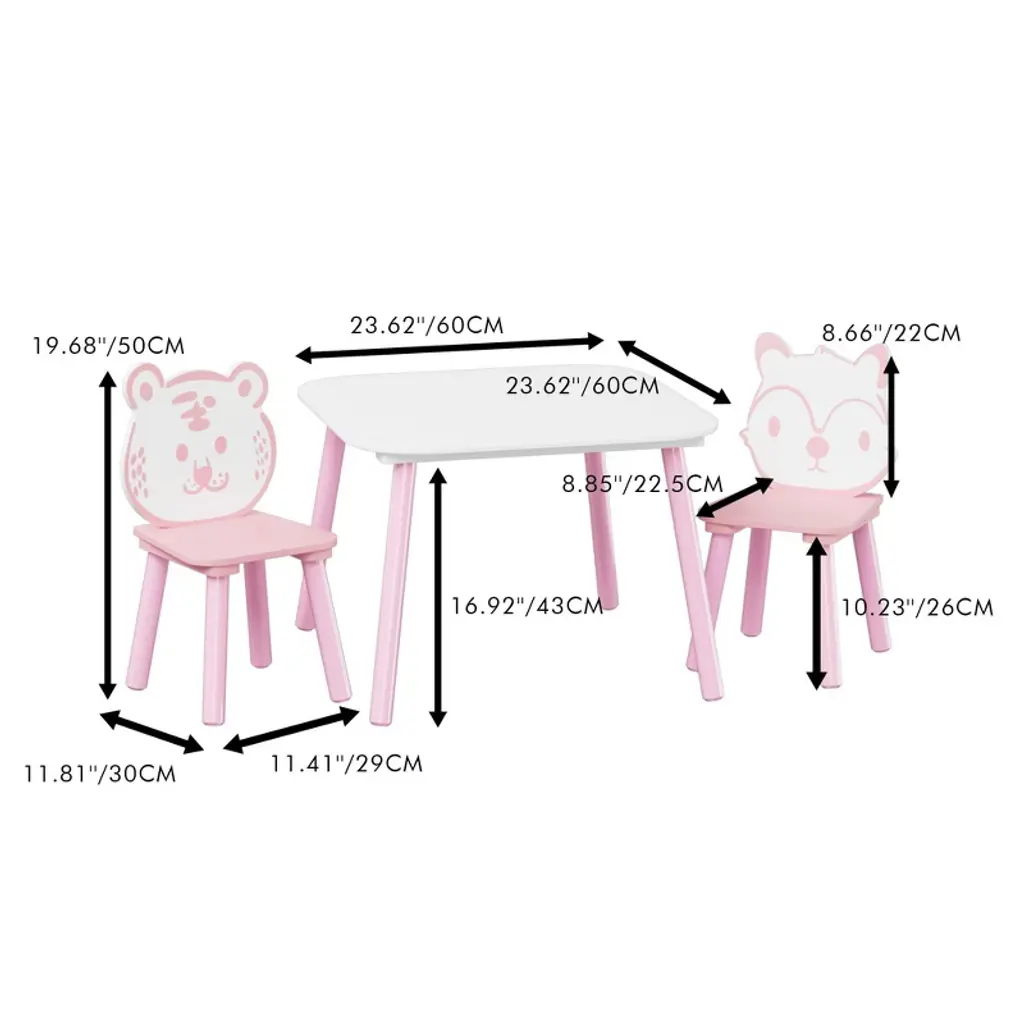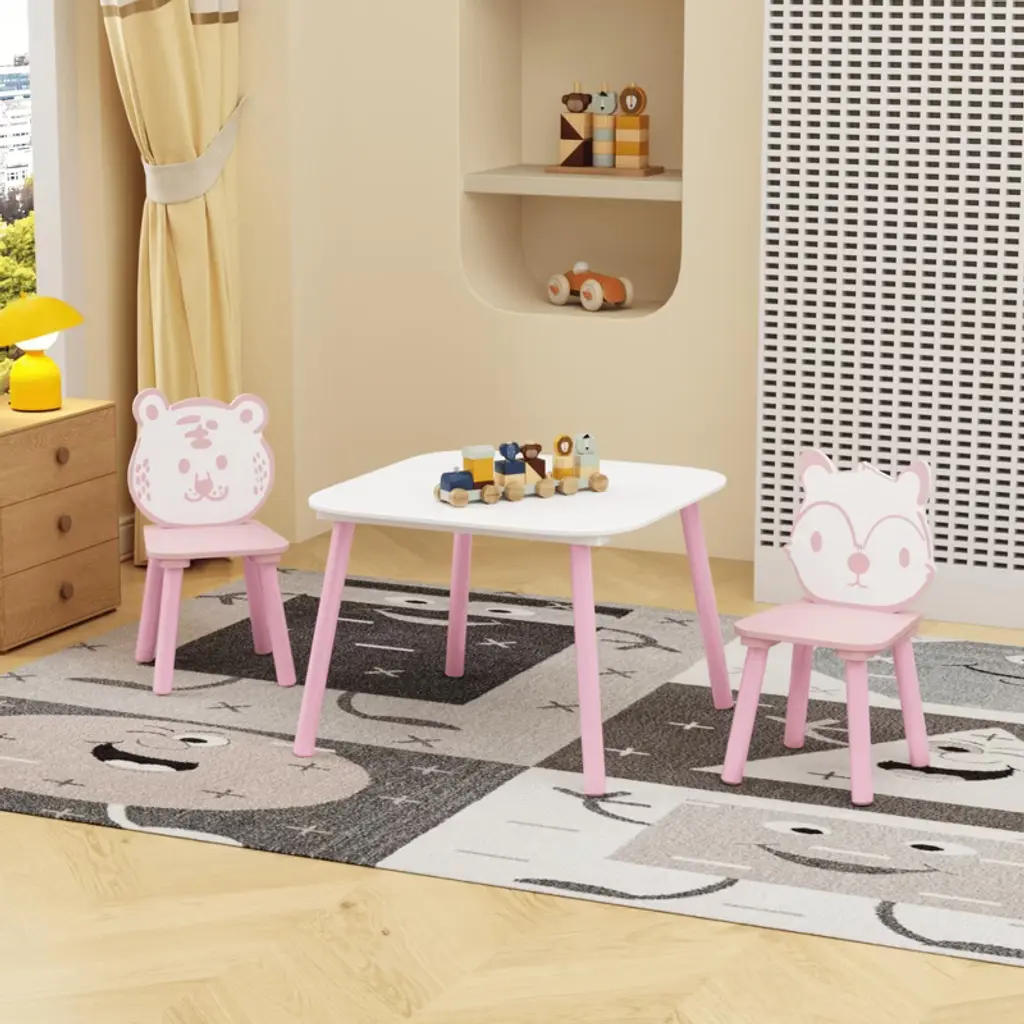 This adorable 3-piece wooden table and chair set is perfect for toddlers! Featuring cute animal-shaped backrests, the sturdy pink & white design fits playrooms or nurseries. Ideal for drawing, learning, or playtime, it encourages creativity while providing a comfy seat. Easy to clean and durable for daily use. A fun, functional gift for little ones!