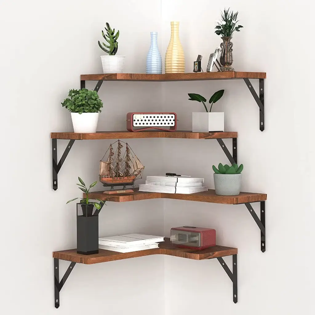 Orrd 4 Pack Corner Floating Shelves, Rustic Wood Wall Storage With Metal Brackets, 88lbs Capacity