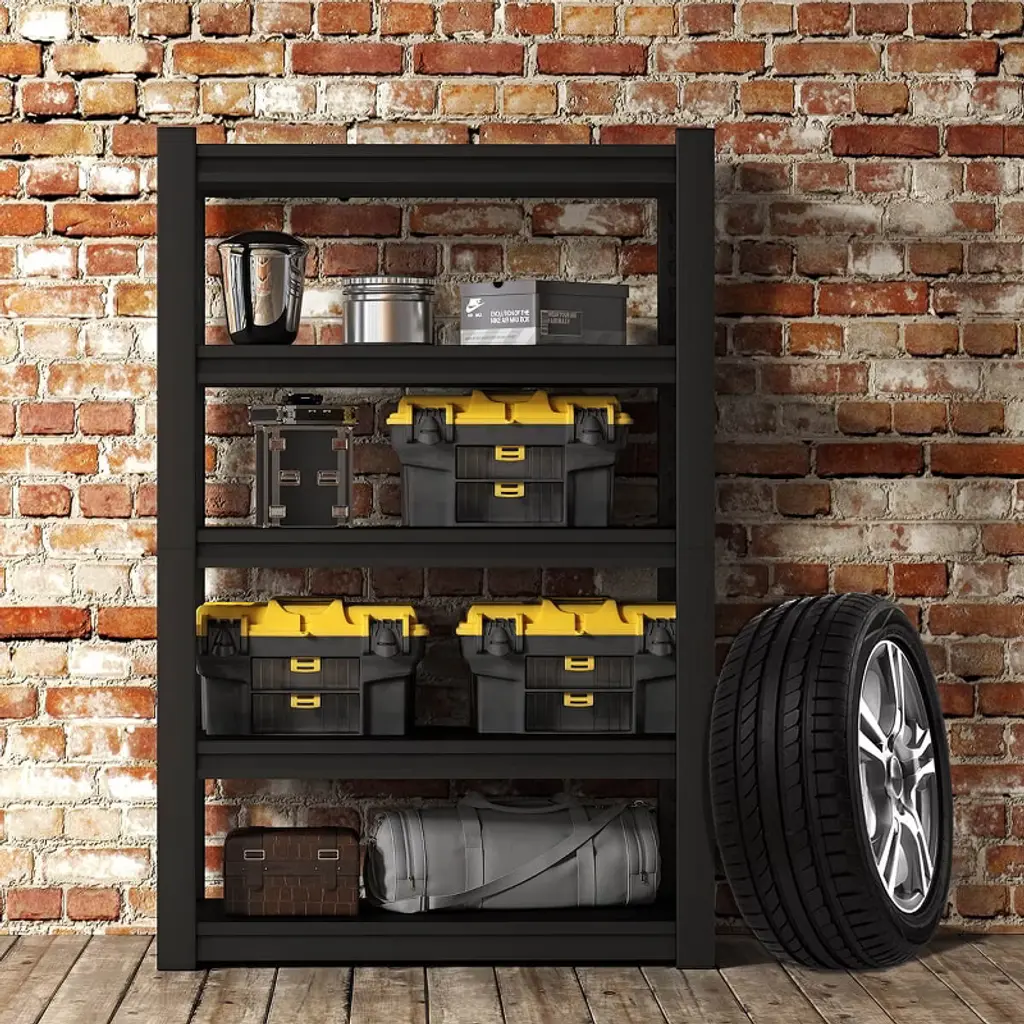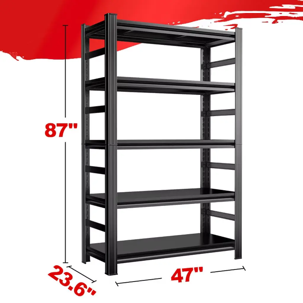 Revolutionize your storage capabilities with our 87" heavy-duty storage rack, a robust and versatile solution for tool rooms, garages, supermarkets, and more. Standing tall at 87 inches, this five-layer metal shelf features adjustable shelves, allowing you to customize the storage space according to your specific needs—perfect for organizing bulky tools, heavy equipment, or merchandise. Crafted from high-grade metal, the rack’s heavy-duty construction ensures it can withstand substantial weight, providing reliable support for your items. The sleek black finish not only adds a touch of modernity but also resists scratches and wear, maintaining its sharp appearance over time. Despite its sturdy build, assembly is straightforward, and all necessary hardware is included, enabling you to set it up quickly and efficiently. Whether you’re looking to declutter a cluttered workspace or optimize storage in a commercial setting, this rack’s ample dimensions of 87"H * 47"W * 23.6"D offer generous storage capacity. Upgrade your storage game with this durable, functional, and easy-to-assemble heavy-duty rack.