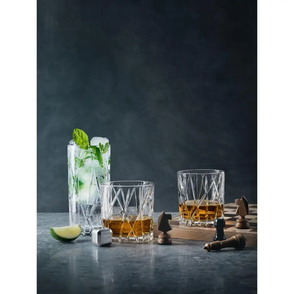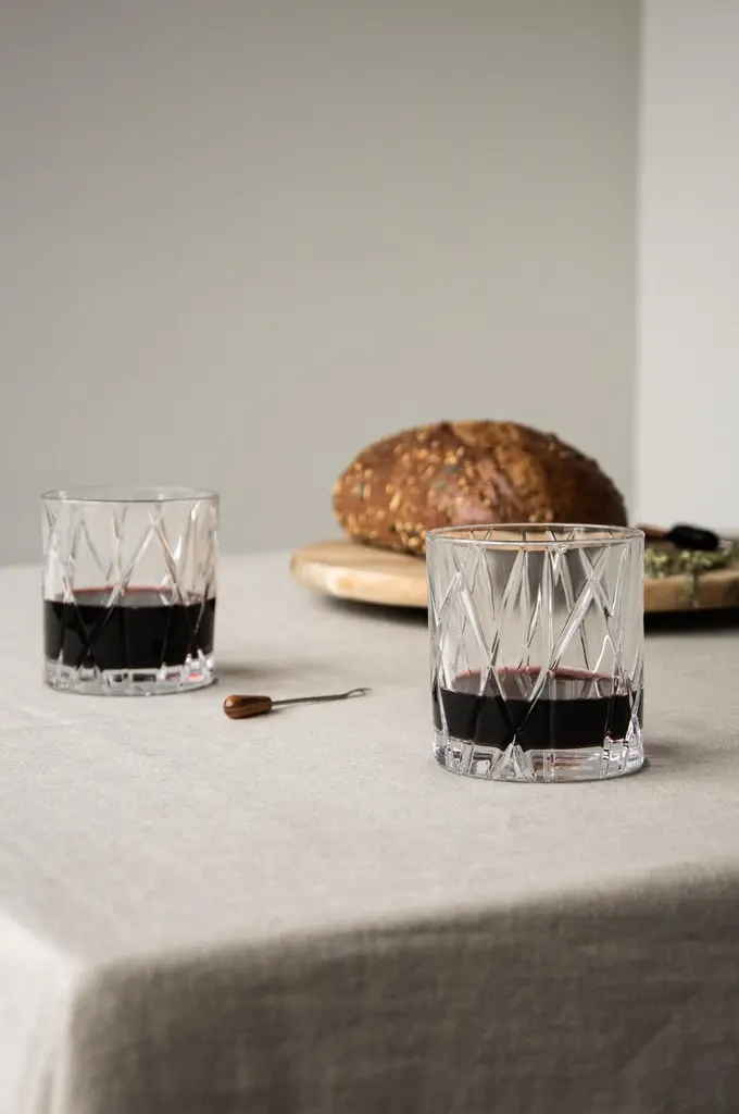 City Double Old Fashioned from Orrefors holds 11 oz and is ideal for serving spirits and cocktails. The cuts that criss-cross the surface of the glass create an asymmetric look, which contributes to the distinct identity of the collection. Designed by Martti Rytkönen.