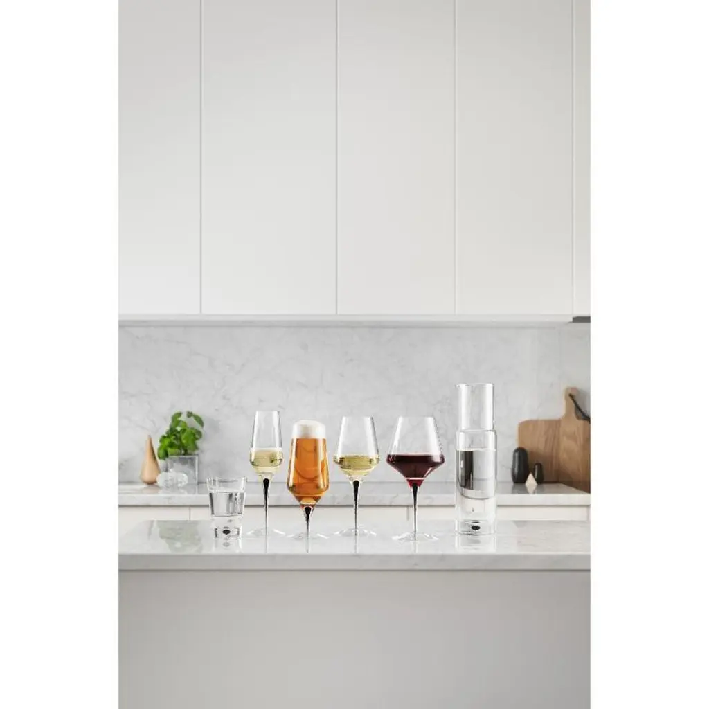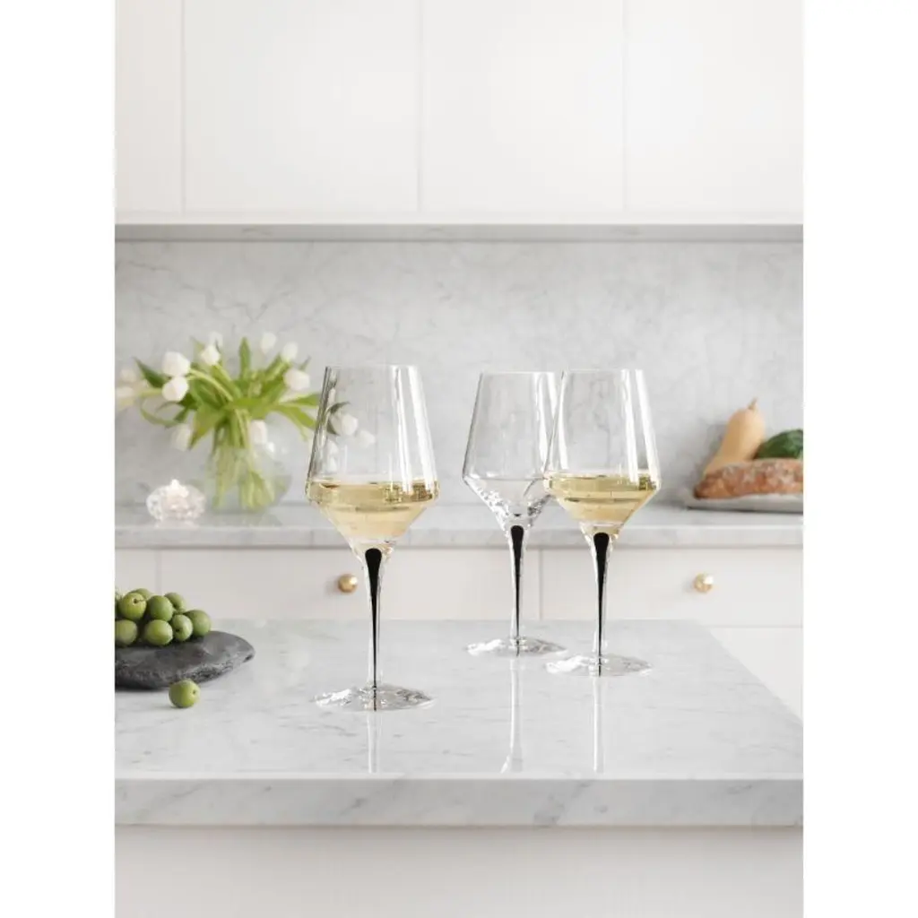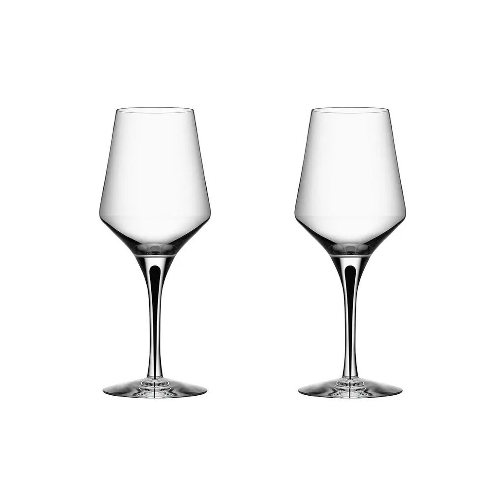 Metropol White Wine from Orrefors, which holds 13.5 oz, is ideal for any white wine. The wine glass is mouth-blown in Sweden by expert glassblowers and inspired by Erika Lagerbielke’s classic Intermezzo design, but with a drop of black sealed inside the stem and a bowl with a more angular and austere shape.