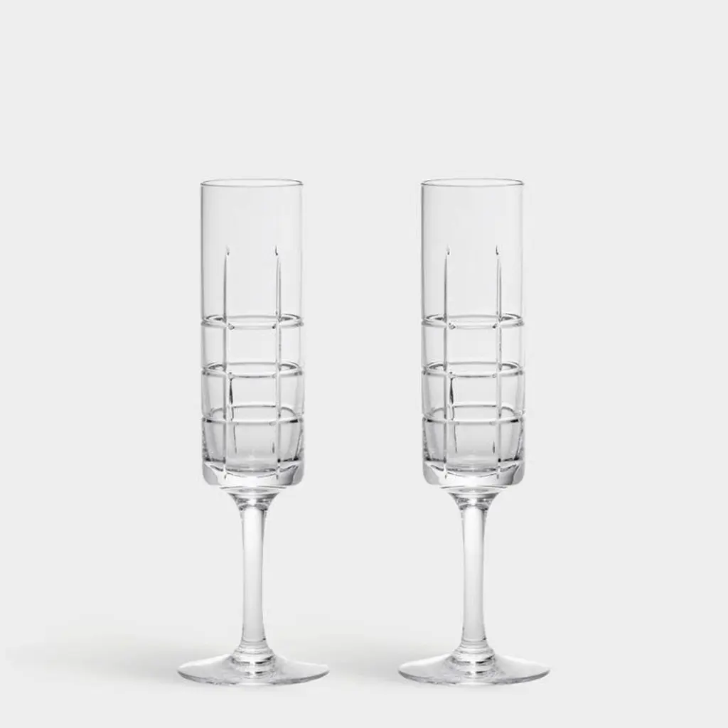 Street Champagne from Orrefors, which holds 5 oz, is well-suited for sparkling beverages, with its long, narrow shape that preserves the bubbles. The flute-shaped glass has a checked motif of straight lines inspired by the criss-cross streets and avenues of Manhattan, New York. Designed by Jan Johansson.