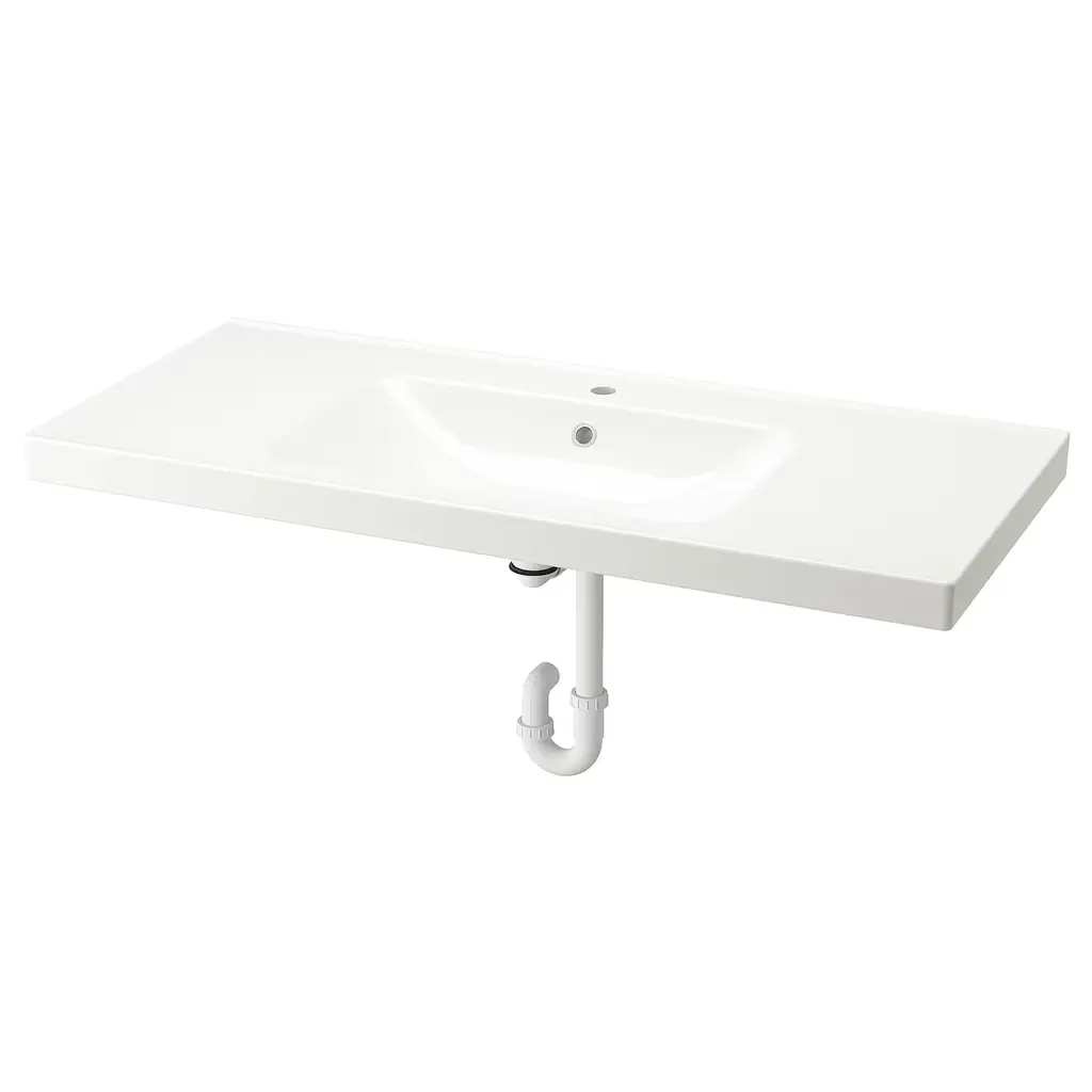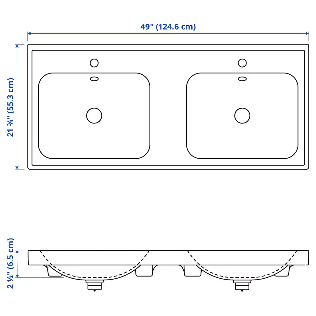 ORRSJÖN Double sink with water trap - white 49x21 3/4 ". This ceramic double-bowl wash-basin with its soft shapes and durable surfaces is made with the best materials and will outlast many years of wear and tear. Use the space on the wash-basin to place toothbrush holder and soap dispenser.