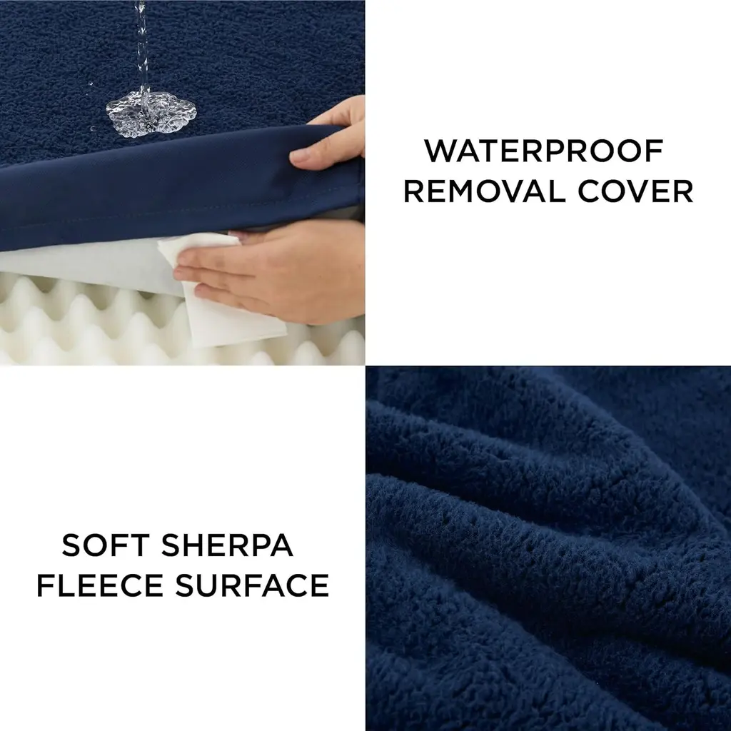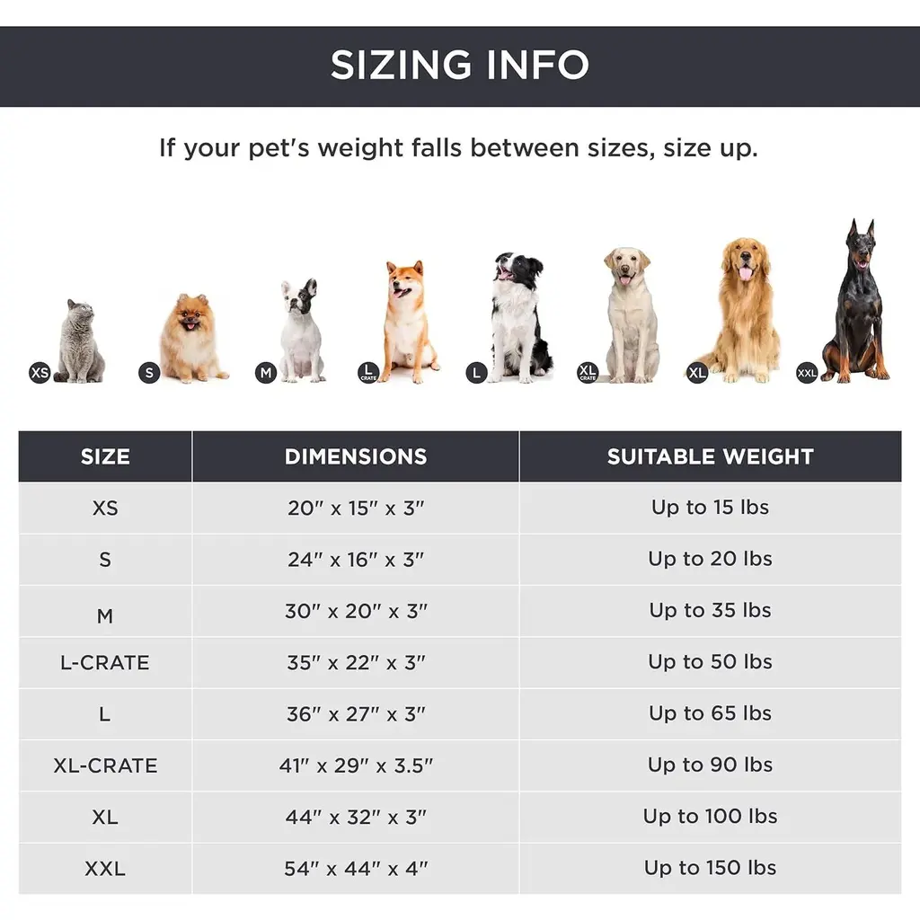 All-Seasons Bed: The two-sided design features warm and cozy sherpa with a reverse side of cool and soft Oxford fabric. Durable and suitable for all-season use¡ªkeep your dog cool in summer and warm in winter for increased comfort. Designed to give your pet unparalleled support for a deep, dreamy sleep. High-density egg-crate foam distributes weight evenly and provides the perfect amount of pressure relief to reduce joint pain and arthritis discomfort. The classic pet bed mattress design gives your fluffy friend plenty of room to sprawl out and get cozy in any position. Easy to carry and ideal for use indoors and outside, in a crate, in your car, or wherever life takes you.Featuring an easy-to-remove, durable, and stain-resistant cover that makes deep cleaning a breeze. Simply machine wash and tumble dry. SIZE: 20.0"L x 15.0"W x 3.0"Th, Suitable for Pet or Cats Up to 15 lbs. SIZE: 24.0"L x 16.0"W x 3.0"Th, Suitable for Pet or Cats Up to 20 lbs. SIZE: 30.0"L x 20.0"W x 3.0"Th, Suitable for Pet or Cats Up to 35 lbs. SIZE: 35.0"L x 22.0"W x 3.0"Th, Suitable for Pet Up to 50 lbs. SIZE: 36.0"L x 27.0"W x 3.0"Th, Suitable for Pet Up to 65 lbs. SIZE: 41.0"L x 29.0"W x 3.5"Th, Suitable for Pet Up to 90 lbs. SIZE: 44.0"L x 32.0"W x 3.0"Th, Suitable for Pet Up to 100 lbs. SIZE: 54.0"L x 44.0"W x 4.0"Th, Suitable for Pet Up to 150 lbs.