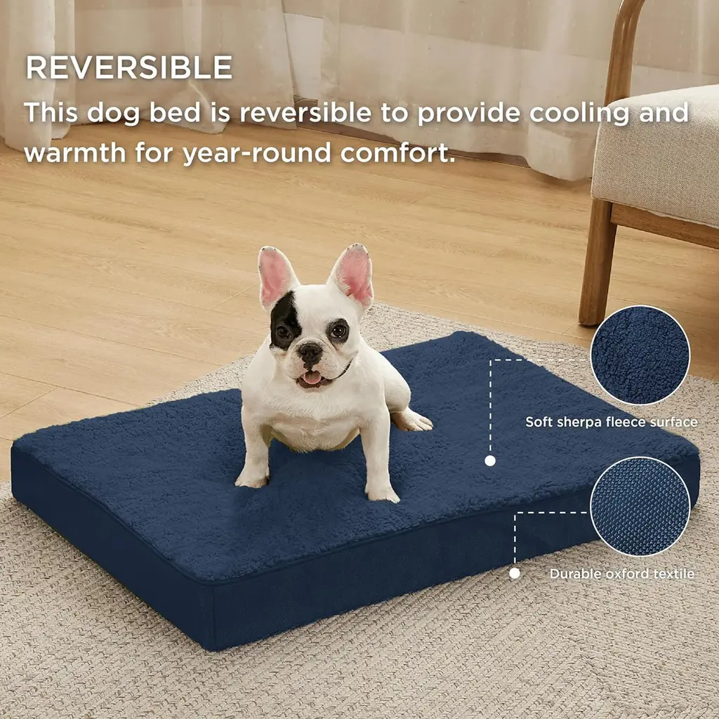 All-Seasons Bed: The two-sided design features warm and cozy sherpa with a reverse side of cool and soft Oxford fabric. Durable and suitable for all-season use¡ªkeep your dog cool in summer and warm in winter for increased comfort. Designed to give your pet unparalleled support for a deep, dreamy sleep. High-density egg-crate foam distributes weight evenly and provides the perfect amount of pressure relief to reduce joint pain and arthritis discomfort. The classic pet bed mattress design gives your fluffy friend plenty of room to sprawl out and get cozy in any position. Easy to carry and ideal for use indoors and outside, in a crate, in your car, or wherever life takes you.Featuring an easy-to-remove, durable, and stain-resistant cover that makes deep cleaning a breeze. Simply machine wash and tumble dry. SIZE: 20.0"L x 15.0"W x 3.0"Th, Suitable for Pet or Cats Up to 15 lbs. SIZE: 24.0"L x 16.0"W x 3.0"Th, Suitable for Pet or Cats Up to 20 lbs. SIZE: 30.0"L x 20.0"W x 3.0"Th, Suitable for Pet or Cats Up to 35 lbs. SIZE: 35.0"L x 22.0"W x 3.0"Th, Suitable for Pet Up to 50 lbs. SIZE: 36.0"L x 27.0"W x 3.0"Th, Suitable for Pet Up to 65 lbs. SIZE: 41.0"L x 29.0"W x 3.5"Th, Suitable for Pet Up to 90 lbs. SIZE: 44.0"L x 32.0"W x 3.0"Th, Suitable for Pet Up to 100 lbs. SIZE: 54.0"L x 44.0"W x 4.0"Th, Suitable for Pet Up to 150 lbs.