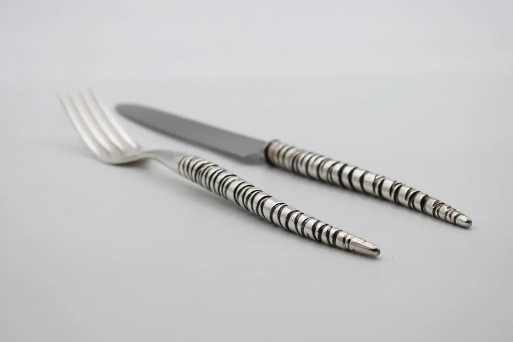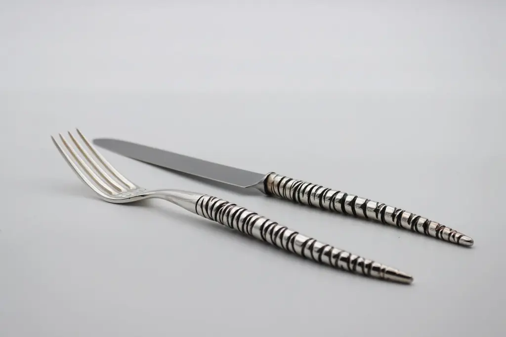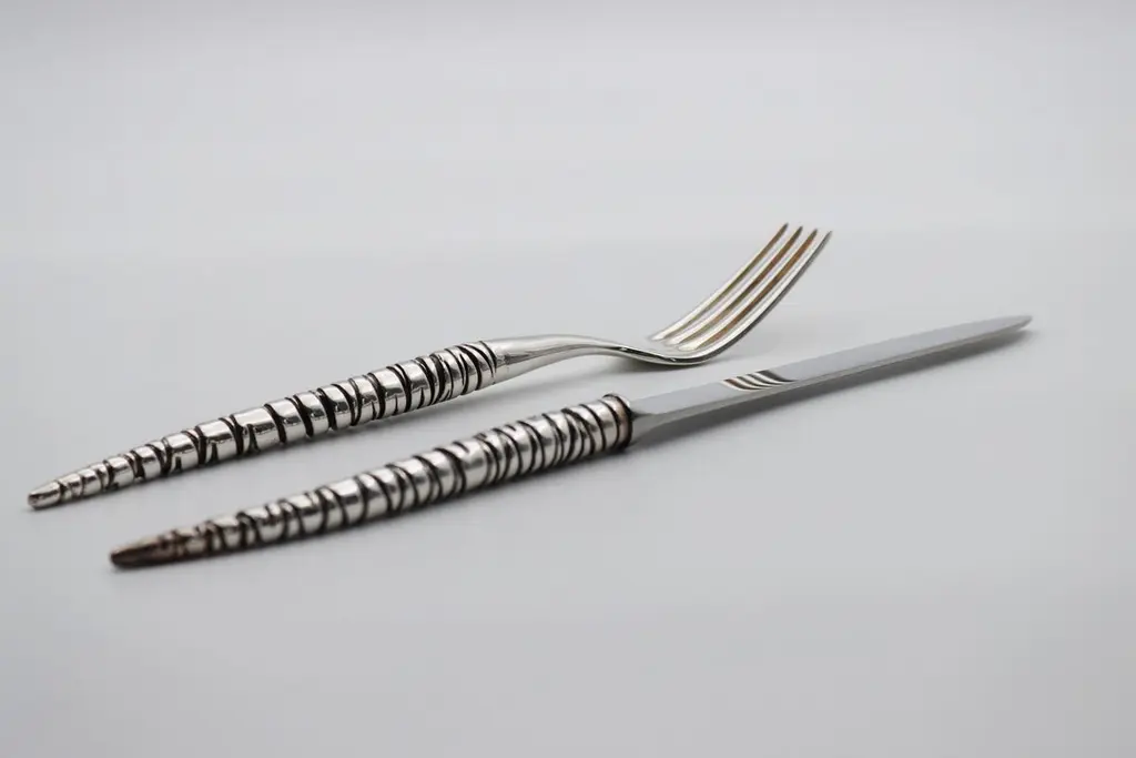 ORYX set of 2 pieces in silver bronze or gold bronze.Set of 2 pieces (table forks/fish, table knife or meat/fish knife) in silver bronze 35/42 microns.It is possible to order all products separately or set of 4 piece.Table spoonTable forkTable knife/meat knife Fish knifeFish fork Dessert/cake/juice/tea-coffee spoonDessert fork Dessert knifeThese pieces are the handmade work of French designer Richard Lauret.These pieces are unique OR made to order.The products can be personalised with customised engraving (price on quotation).In the same collection are presented SERVICE PIECES, TABLE ACCESSORIES, INDIVIDUAL COVERS. Contact us for more information.