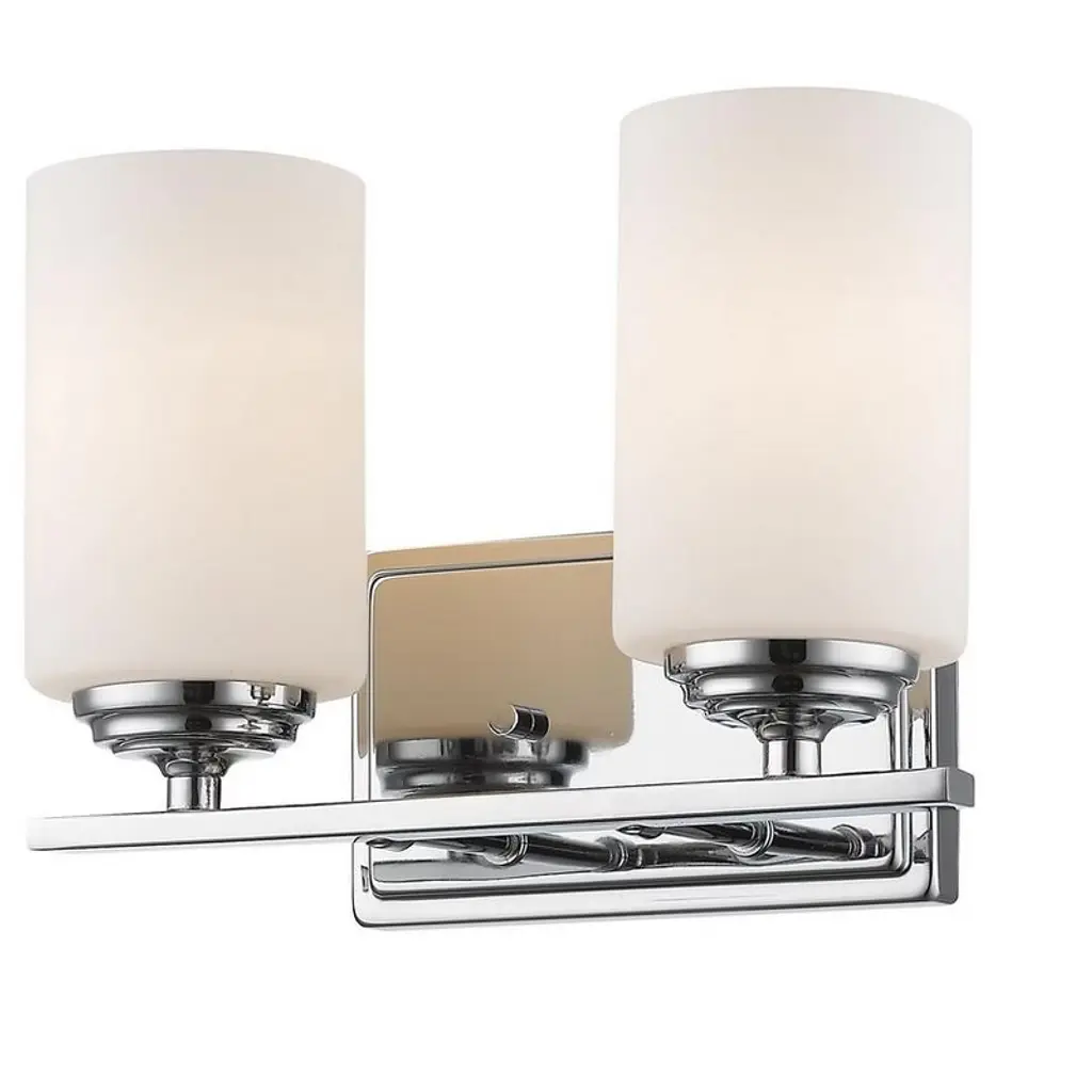 The Generation Lighting Lighting Oslo two light vanity fixture in chrome is an ENERGY STAR qualified lighting fixture that uses fluorescent bulbs to save you both time and money. The Oslo lighting collection by Generation Lighting Lighting is a sleek design, with smooth and clean lines. The Opal Etched glass adds to this collection''s contemporary and minimalist character. Offered in Chrome, Brushed Nickel, Burnt Sienna and textured Blacksmith finishes, the collection includes nine-, five-, and three-light chandeliers, pendants in four sizes, both flush and semi-flush ceiling fixtures, as well as one-, two-, three- and four-light wall/bath fixtures. Both incandescent lamping and ENERGY STAR-qualified LED lamping are available. All fixtures are California Title 24 compliant.Lighting Information:Bulb type: 2 A19 Medium 9.3 watt light bulbsNumber of bulbs: 2Bulb(s) includedcETL Listed