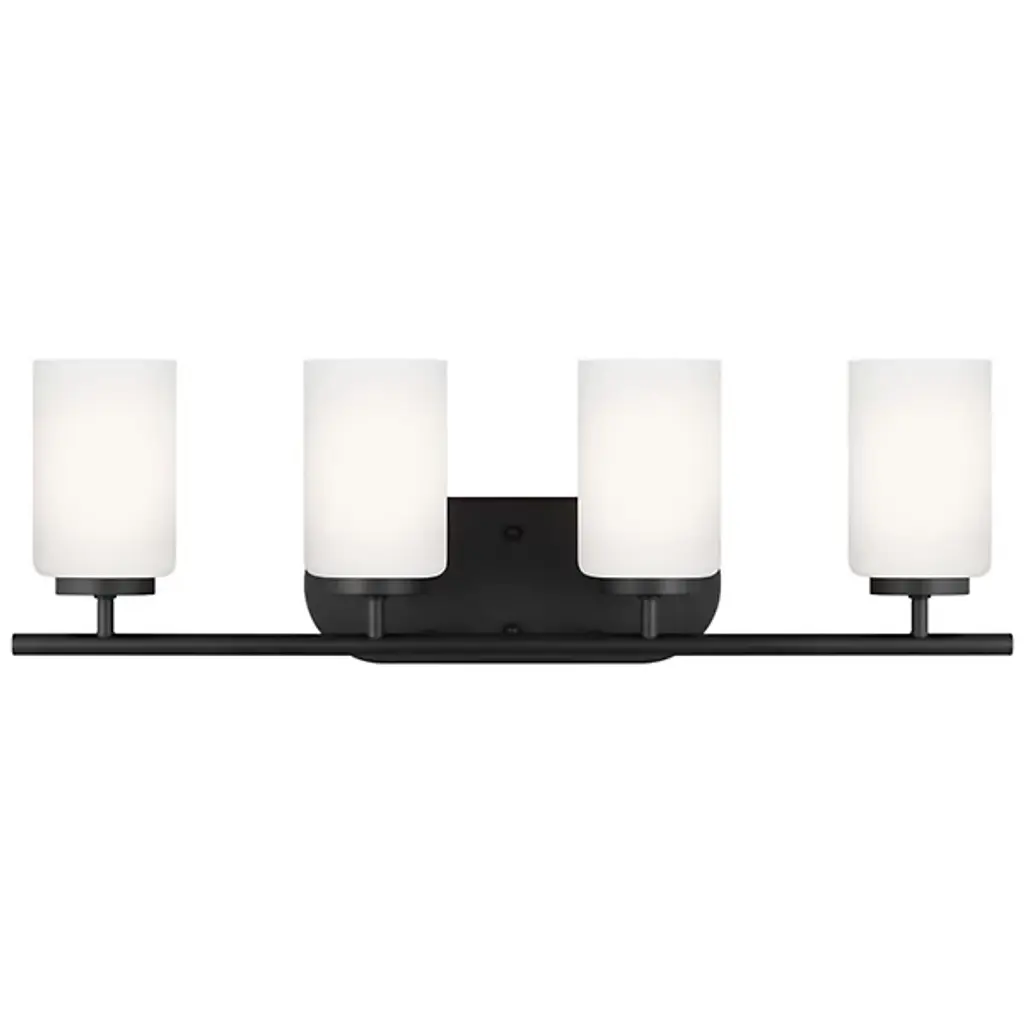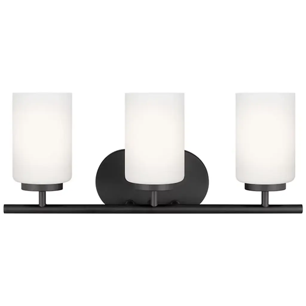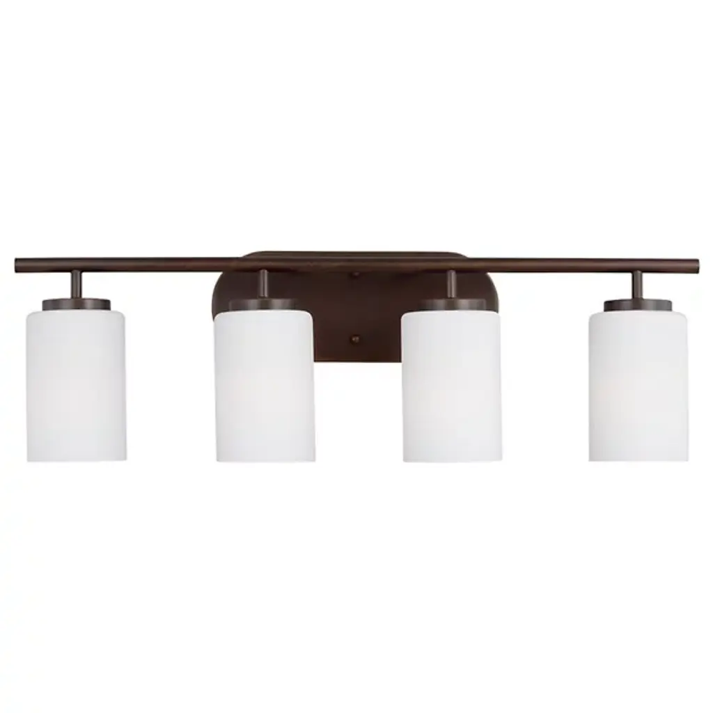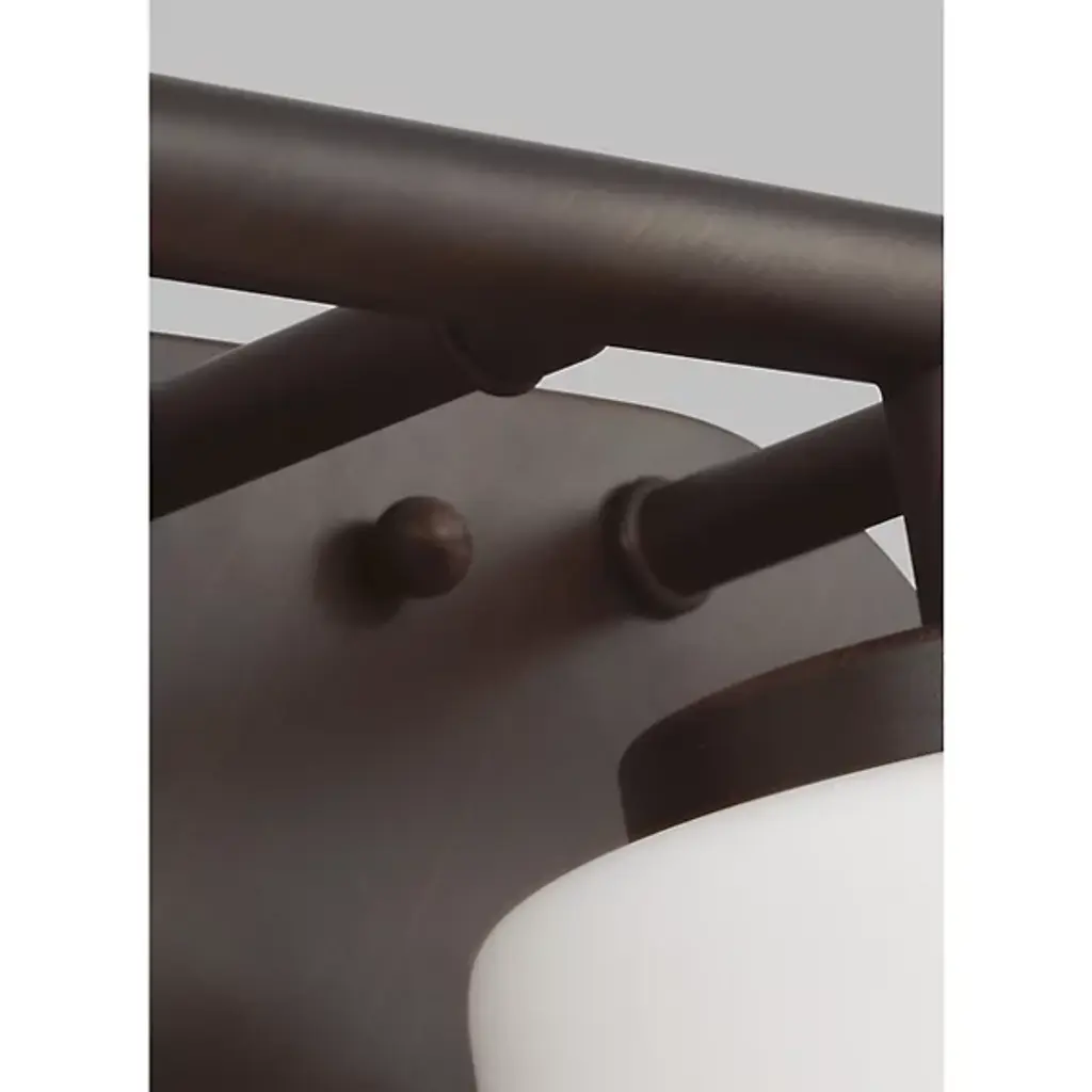 The Oslo Vanity Light by Generation Lighting, formerly known as Sea Gull Lighting, provides a simple, clean design for your bathroom setting. A series of Opal Etched glass shades sit equidistant atop a finished-Steel bar anchored by a rounded rectangular wallplate. The smooth, clean lines of each element gives the fixture a distinct contemporary charm, especially when lit and the glowing shades blend with the natural warmth of the metal.