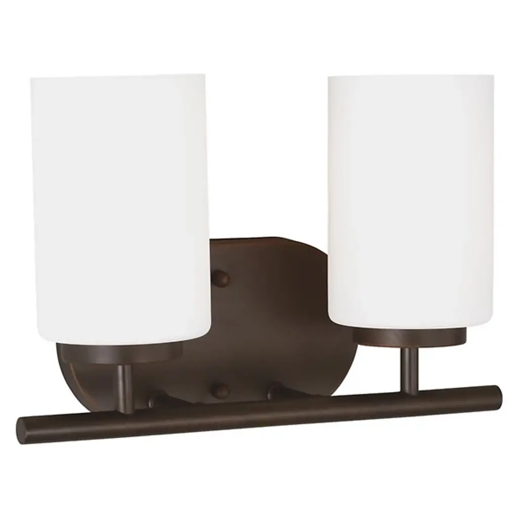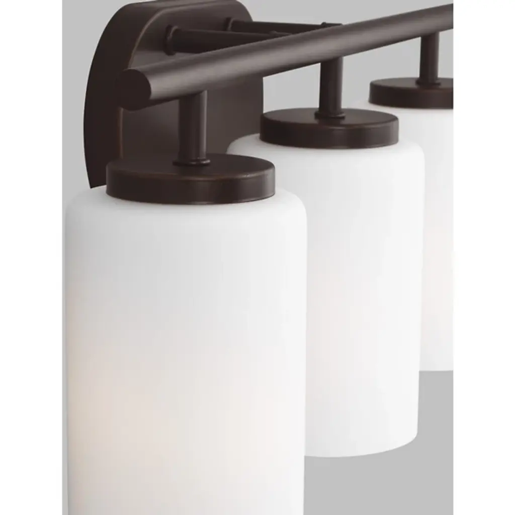 The Oslo Vanity Light by Generation Lighting, formerly known as Sea Gull Lighting, provides a simple, clean design for your bathroom setting. A series of Opal Etched glass shades sit equidistant atop a finished-Steel bar anchored by a rounded rectangular wallplate. The smooth, clean lines of each element gives the fixture a distinct contemporary charm, especially when lit and the glowing shades blend with the natural warmth of the metal.