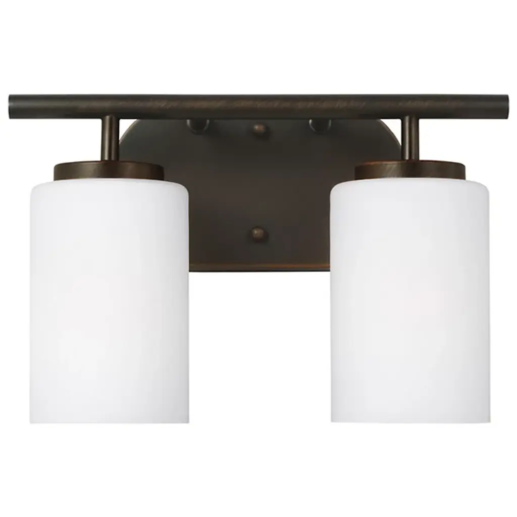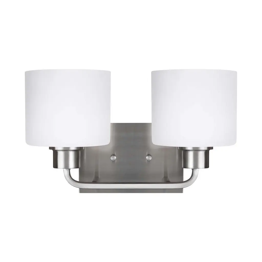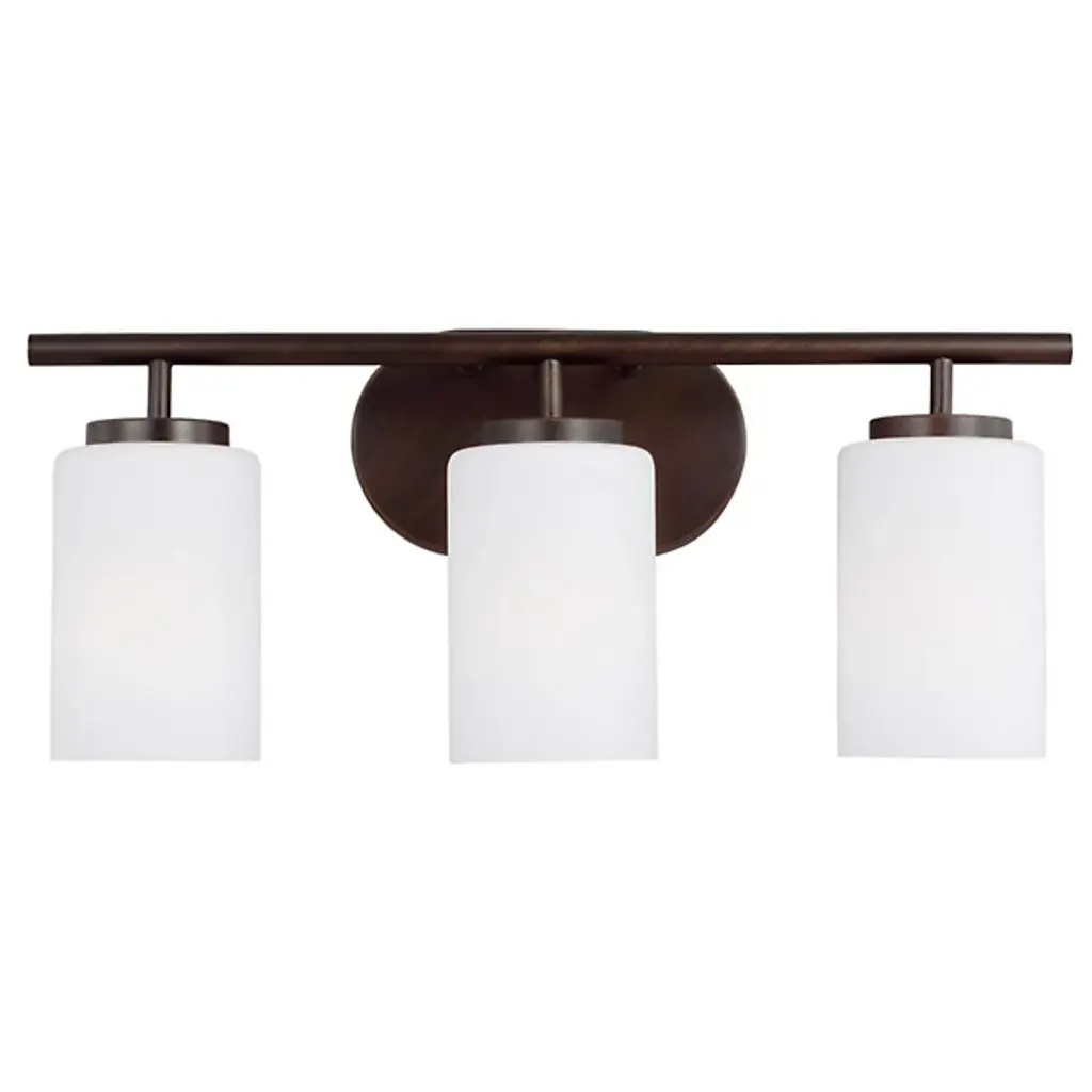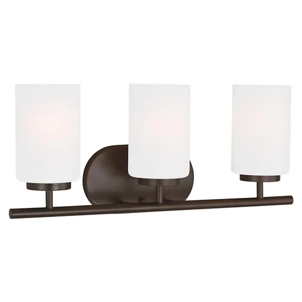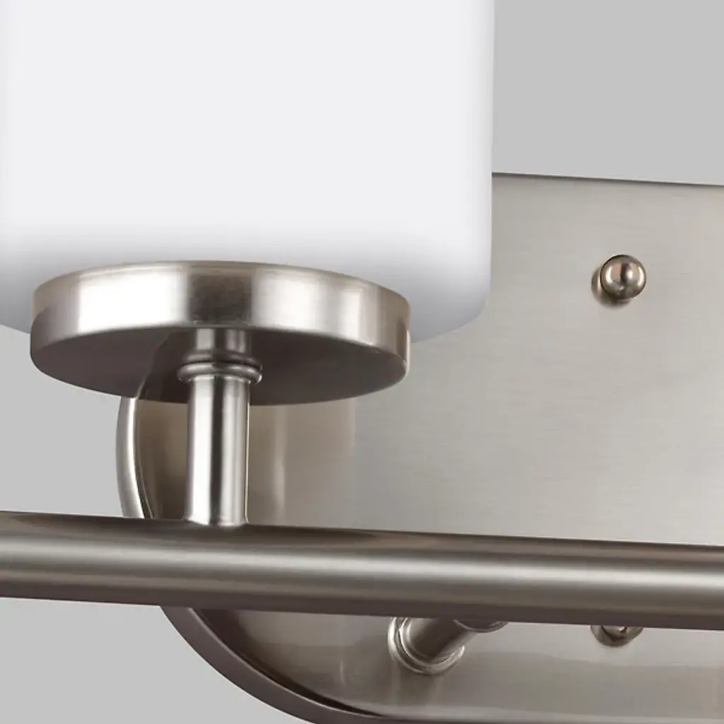 The Oslo Vanity Light by Generation Lighting, formerly known as Sea Gull Lighting, provides a simple, clean design for your bathroom setting. A series of Opal Etched glass shades sit equidistant atop a finished-Steel bar anchored by a rounded rectangular wallplate. The smooth, clean lines of each element gives the fixture a distinct contemporary charm, especially when lit and the glowing shades blend with the natural warmth of the metal.
