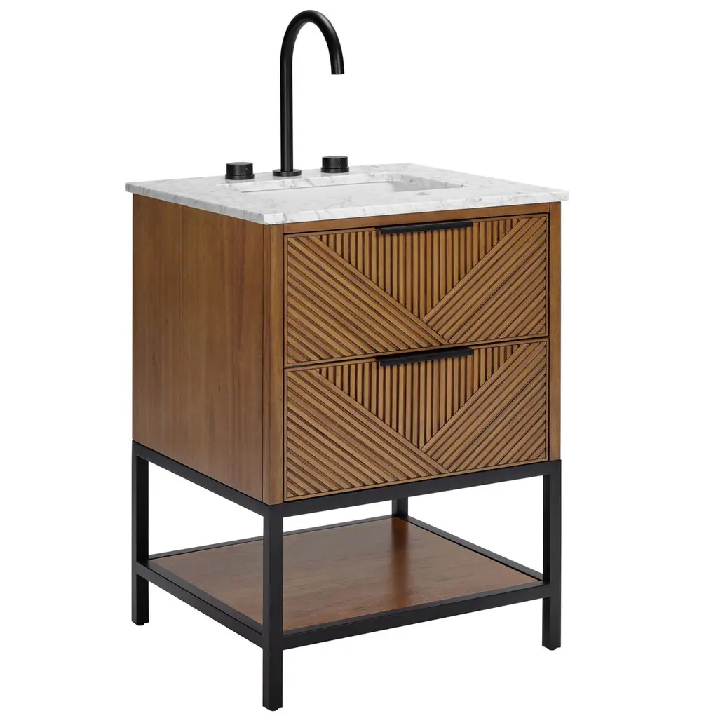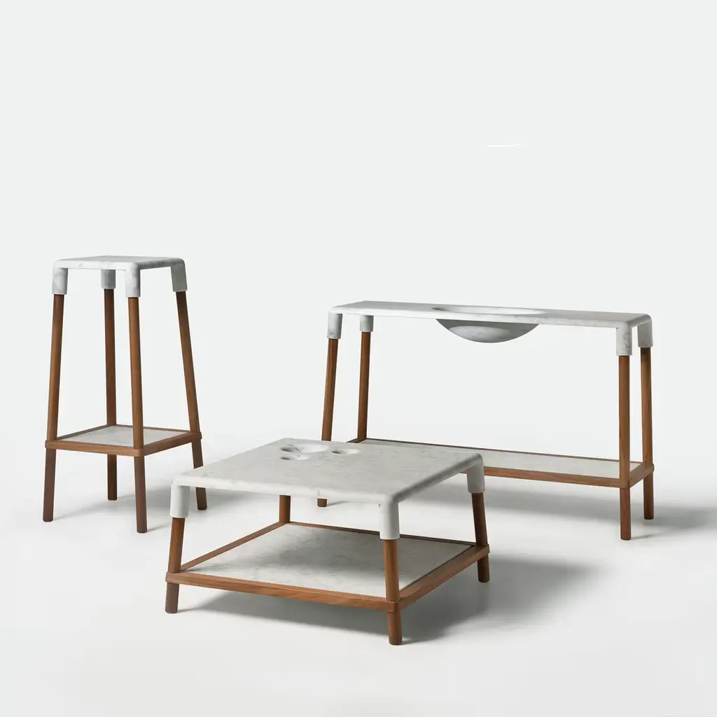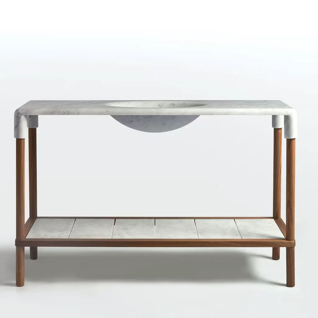 Designed by Gritti Rollo, this elegant console is part of the Oslo collection, an elegant series of pieces of mid-century inspiration that boast a top in marble bending at the corners to enclose the structure in walnut. The standout element of this superb and unique design is the concave central element on the top, which can be a useful container, while also adding a textural accent to its smooth surface. More display space is featured below, with a horizontal surface of marble slate tiles. Other types of marble are available, please ask the Concierge.