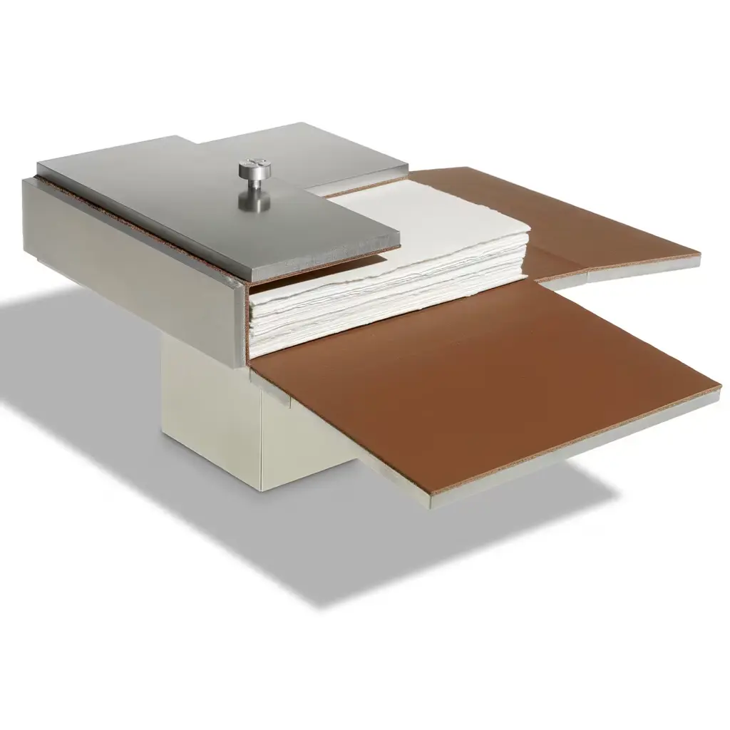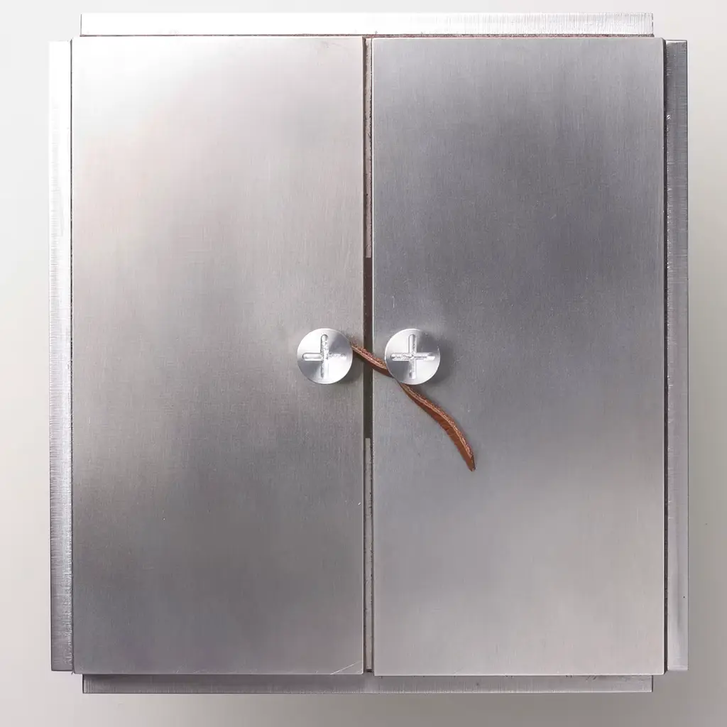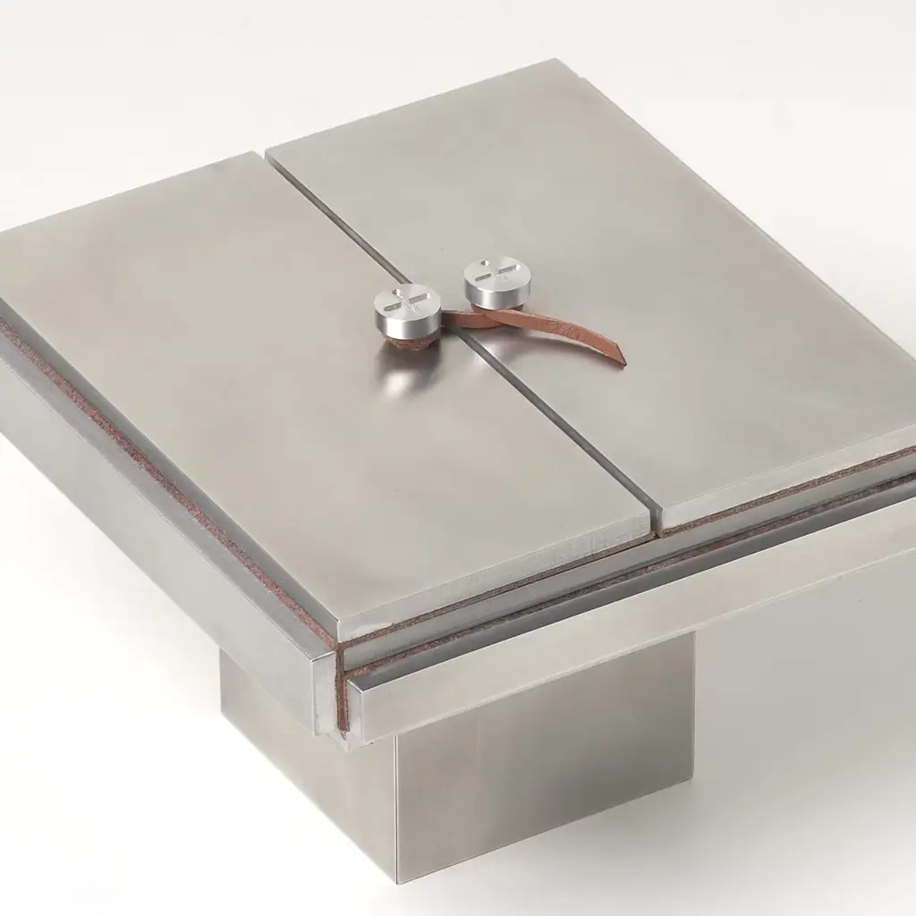 This exquisite piece is named after the essay from philosopher Remo Bodei ("Guests of Life" in English), and was specifically designed by Michele De Lucchi to contain the small essay-book. A refined and exclusive object, this case is crafted of satin aluminum plates mounted on full-grain leather.