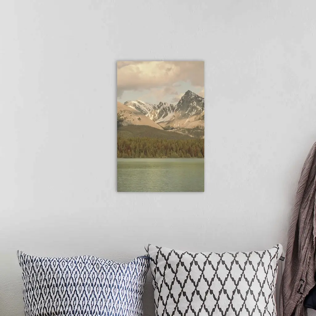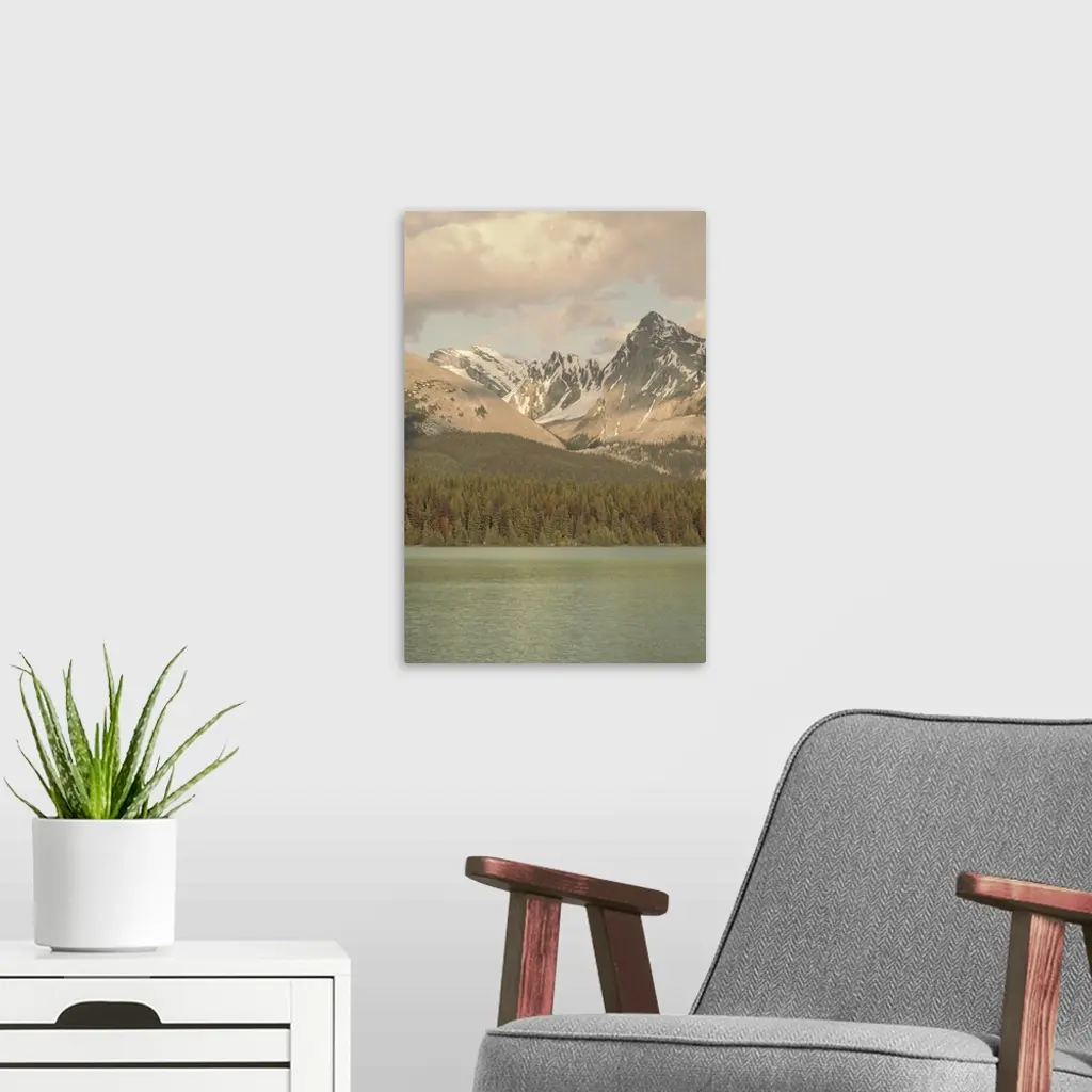Wilderness shoreline of Pyramid Lake in Jasper National Park, Alberta, Canada