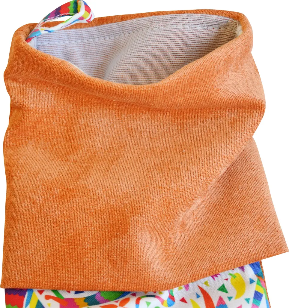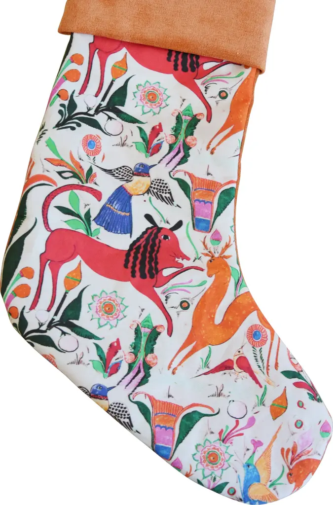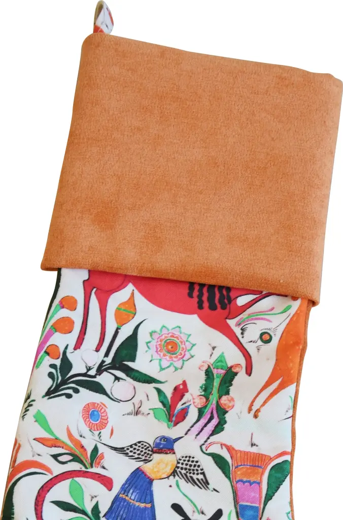 Custom-tailored Christmas stocking made from colorful Otomi-style cotton fabric depicting an array of colorful animals. Reverse and cuff is a cotton velvet fabric. Stocking is lined and has an attached matching hanging loop. No maker's mark. Please note: the placement of the design may vary according to the fabric cut.