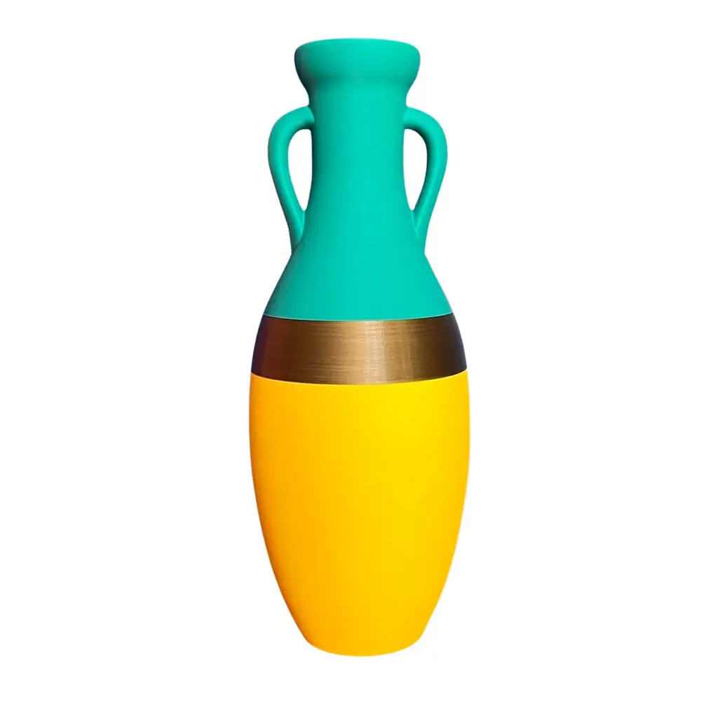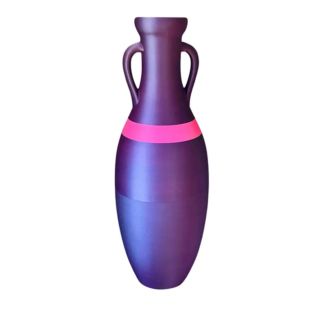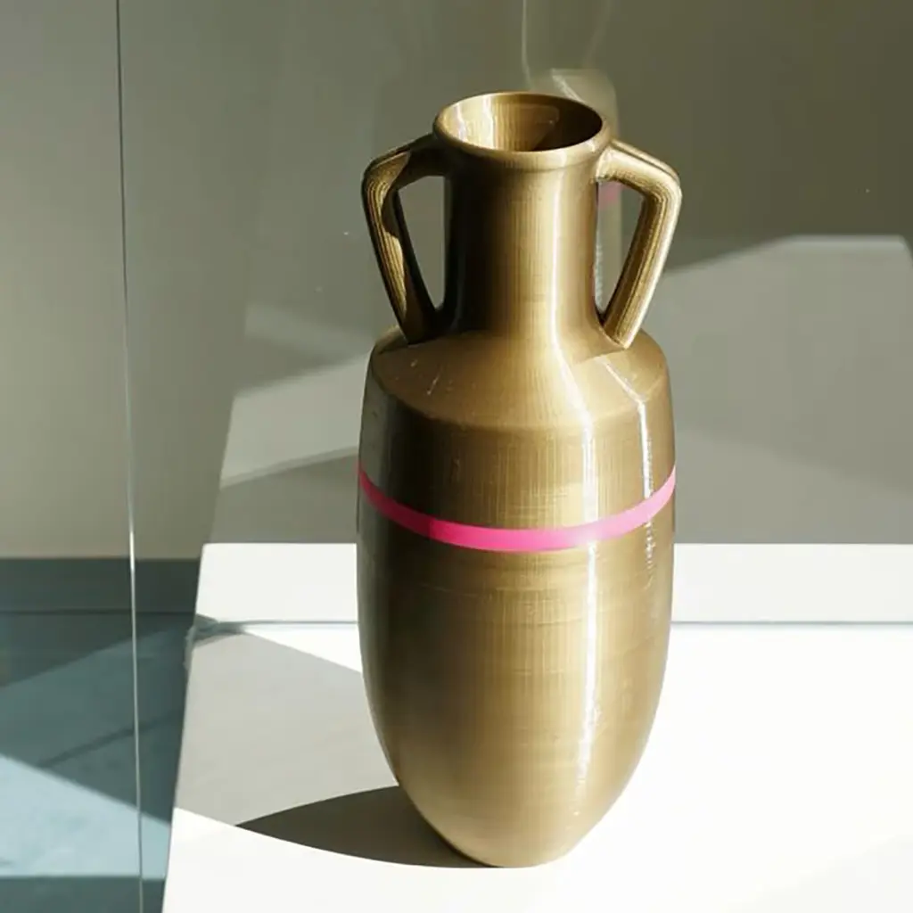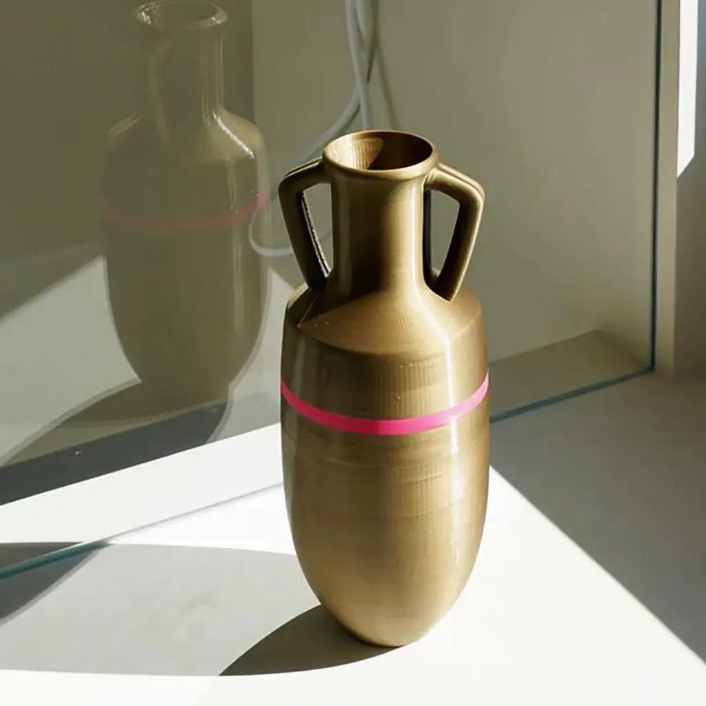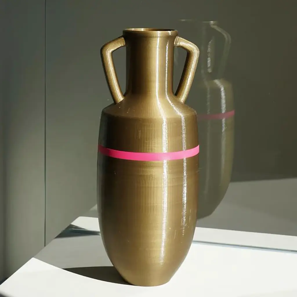 This vase is a pop reinterpretation of the archetypal shape of Roman amphorae. The main inspiration for this object has been Montestaccio's archeological site studied by Heinrich Dressel. The vase is produced with the use of 3D printing and the best quality of PLA (thermoplastic derived from renewable resources, compostable in industrial facilities). The sustainable and elegant vase is the perfect design for a chic enviroment.