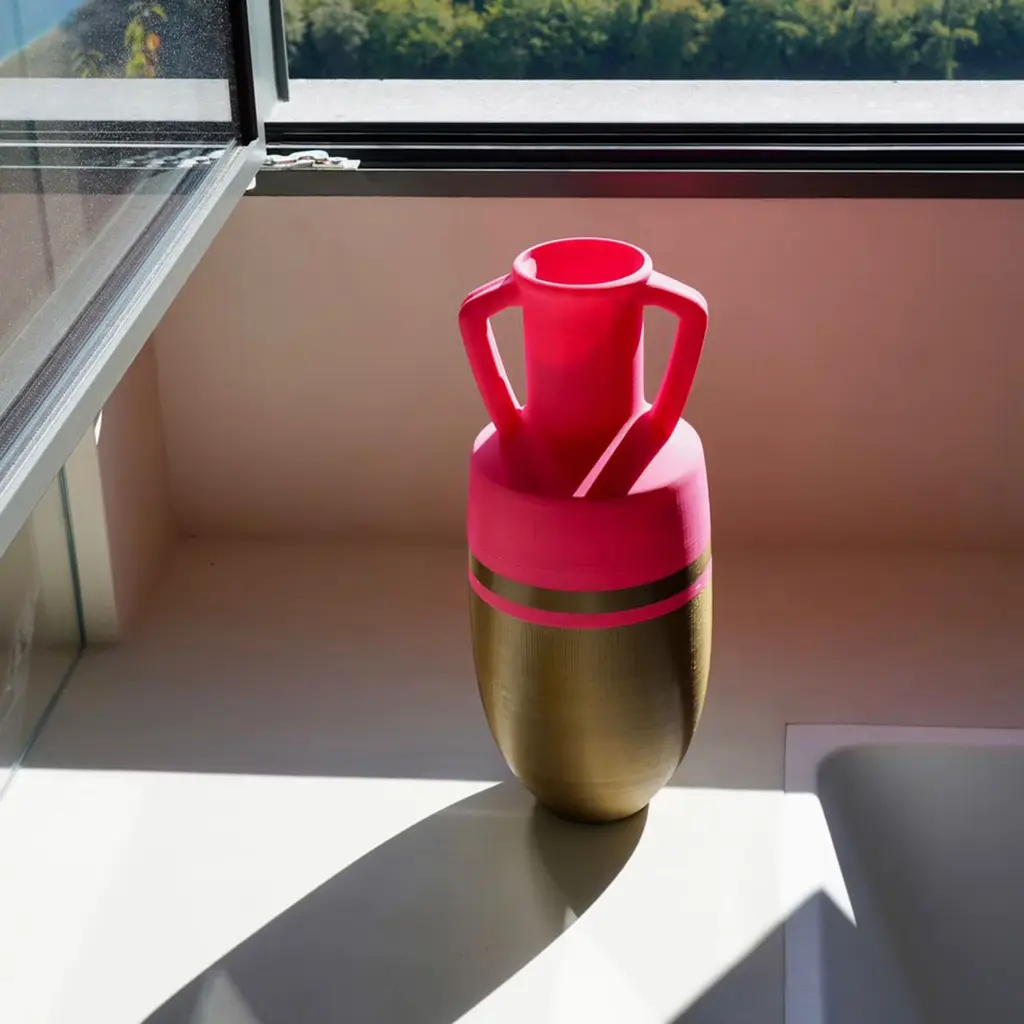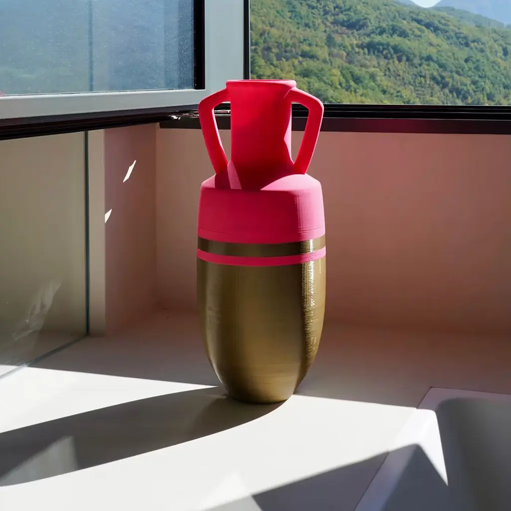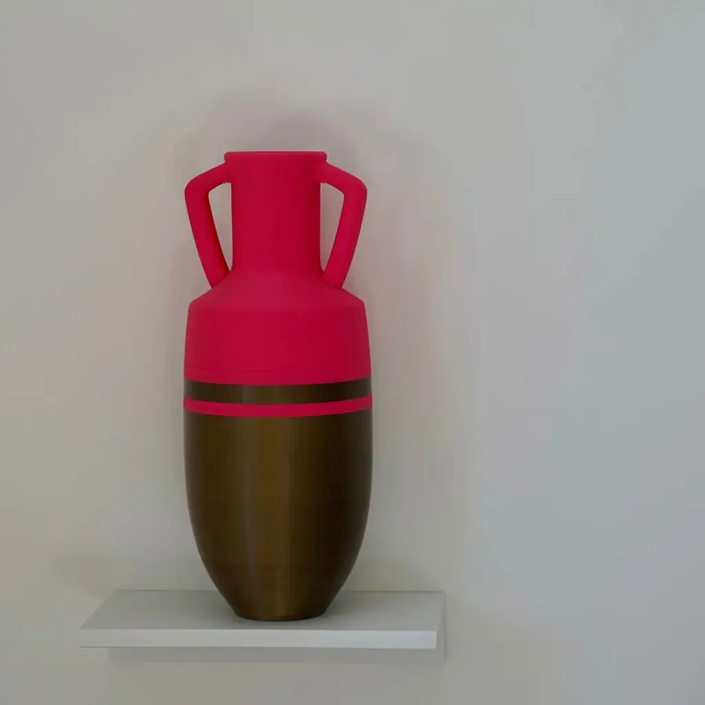 This vase is a pop reinterpretation of the archetypal shape of Roman amphorae. The main inspiration for this object has been Montestaccio's archeological site studied by Heinrich Dressel. The vase is produced with the use of 3D printing and the best quality of PLA (thermoplastic derived from renewable resources, compostable in industrial facilities). The sustainable and elegant vase is the perfect design for a chic enviroment.