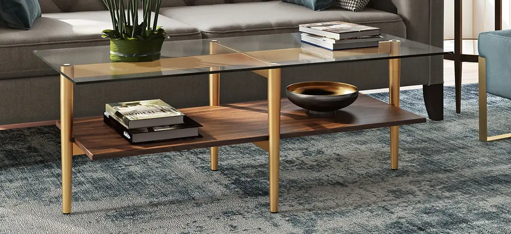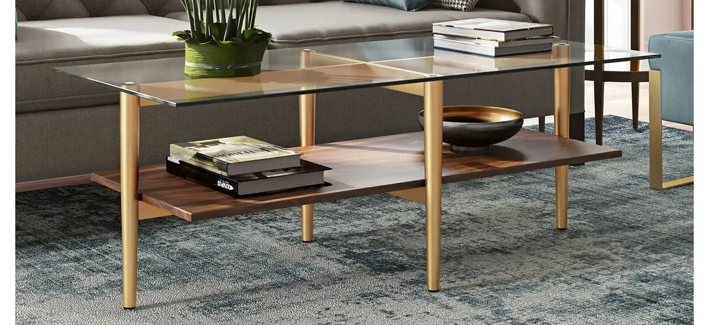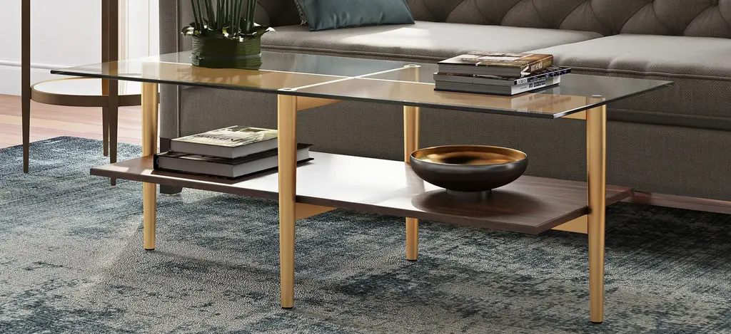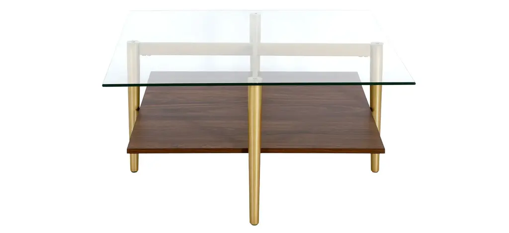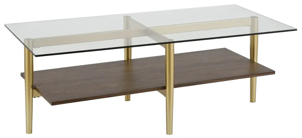 This mid-century inspired Otto coffee table is the perfect pick for your living room or den ensemble. Its base features four tapered legs connected at the center. The top is a transparent tempered glass which shows off the architectural connection and carries the rectangular design through the frame. The lower shelf is made with a walnut finish, playing off the tempered glass in size and shape. It's finished in walnut making it classic and neutral enough to work in any space.