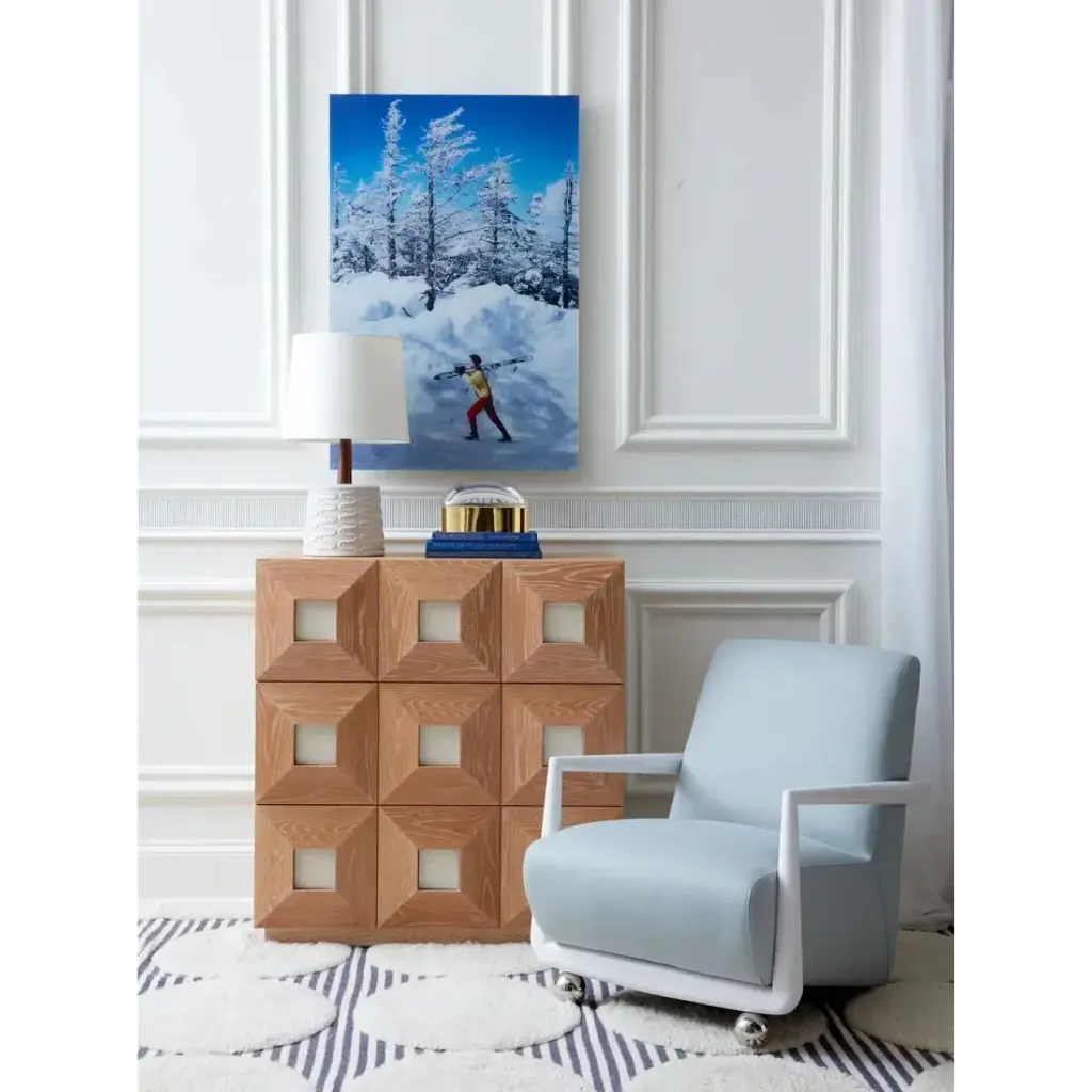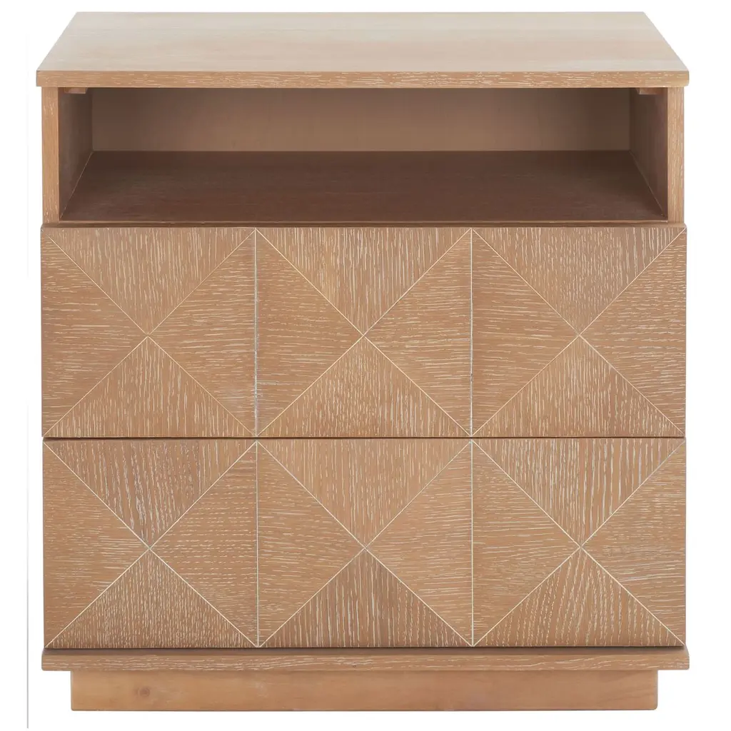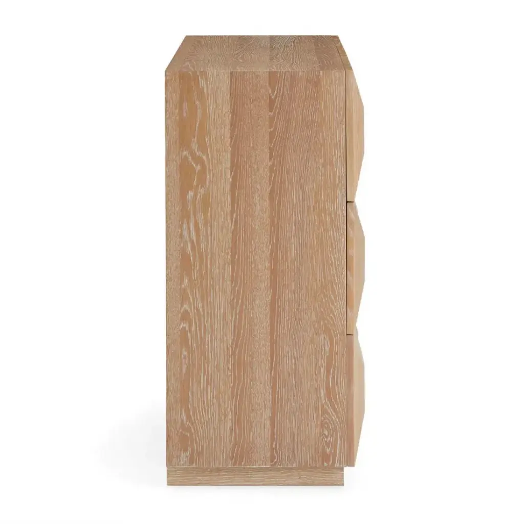 Crafted from wire-brushed and limed solid oak and featuring three drawers faced with ivory leather insets detailed with timeless topstitched borders. Perched on a recessed base, our Otto Three-Drawer Cabinet feels couture in your Brooklyn Brownstone and chic in your Tribeca loft. Our collection of artisan crafted solid oak furniture is as mighty as its source. Wire-brushing exposes the natural wood grain and our liming technique accentuates each solid piece of wood's unique pattern. A nod to French 50s cool, a dash of Milanese moxie, and a whisper of Scandinavian soulfulness.