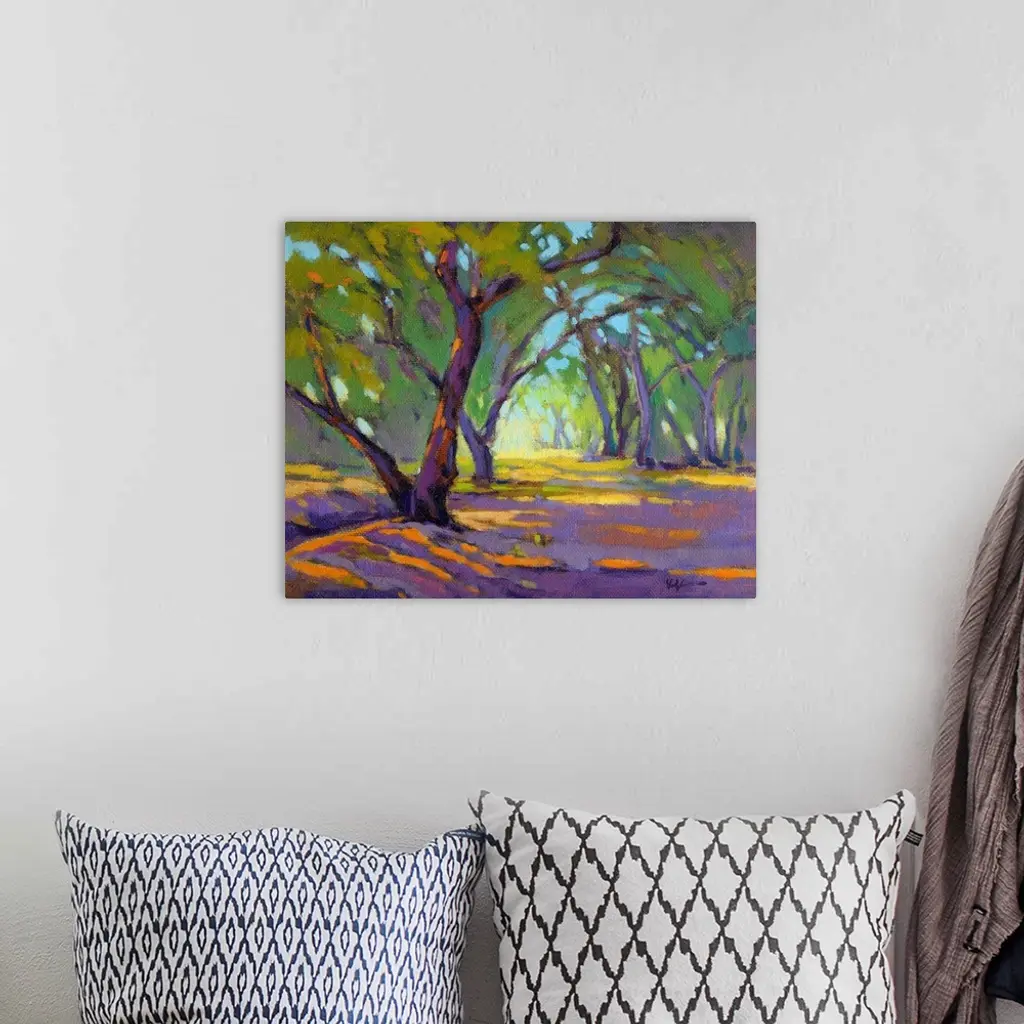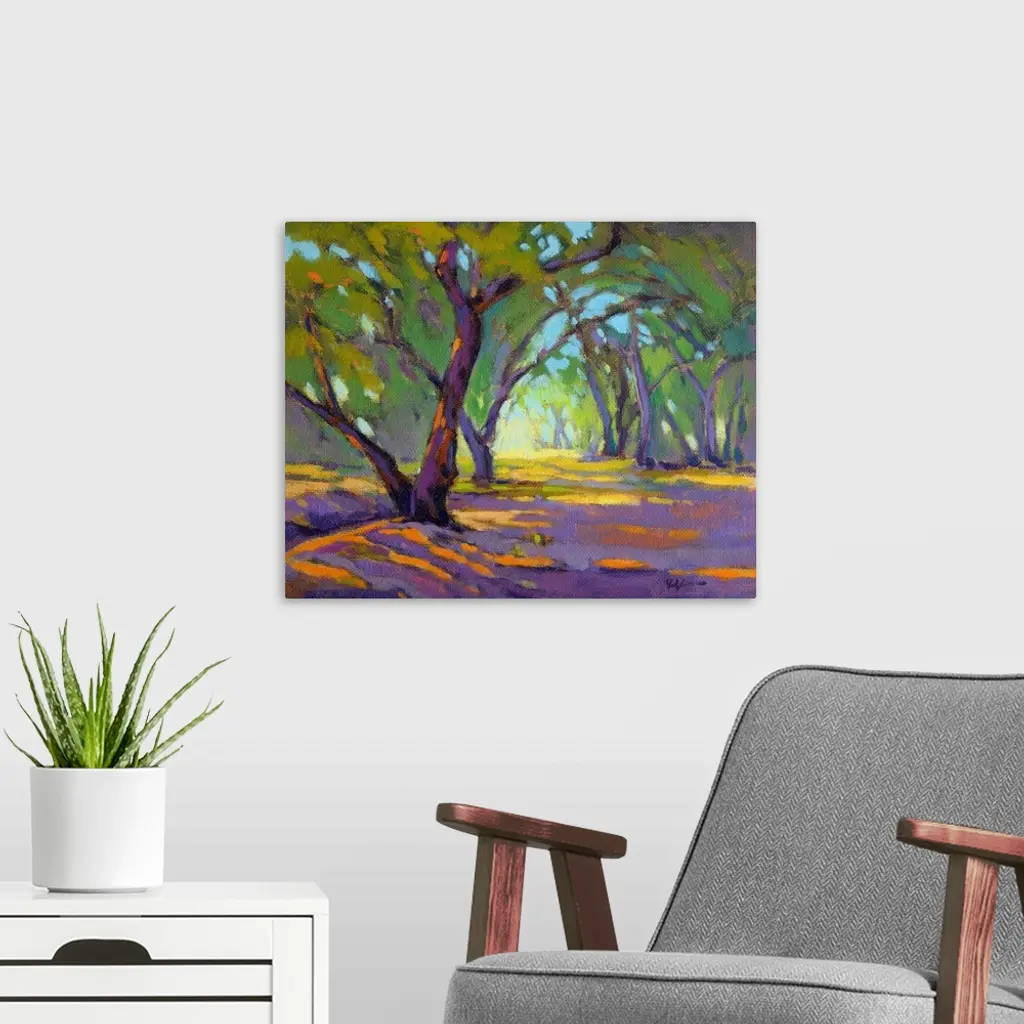 Contemporary landscape with curved trees in a forest setting made with purple, orange, yellow, and green hues.