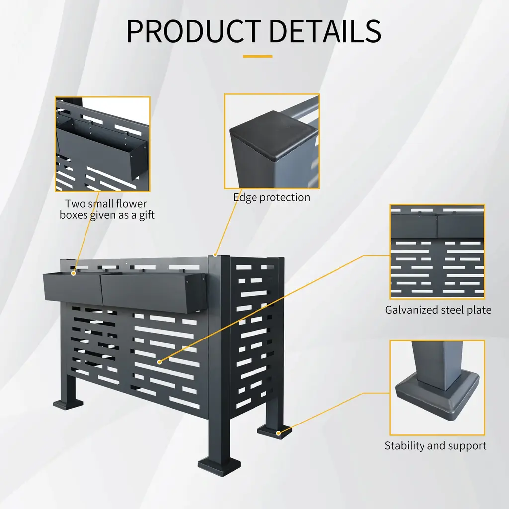 Product Features· 3 CONCEALMENT PANELS It comes with 3 fence panels.This is perfect for concealing 3 sides of an air conditioning unit. Comes in a charming charcoal color finish.Not only conceal your AC unit, add beauty and charm to your home.· PREMIUM-GRADE MATERIALS Use professional grade galvanized plate, coated with powder coating, will not rust, will not warp, will not crumble, will not rot, easy to maintain and clean. Perfect for your patio, patio, backyard, garden or other outdoor space as a privacy screen to cover mini split outdoor air conditioning units.· EASY TO ASSEMBLE Effortlessly attach the planter boxes to the side of the screen for an instant enhancement. The privacy shield kit includes 4 uprights,4 ground anchors, and 4 aluminum foot covers. And equipped with screws, easy to install. The only tool you need is a drill or a screwdriver. See assembly instructions for more information.· MULTIPLE BENEFITS This shutter screen enclosure is designed as a privacy screen to cover outside air conditioning condenser units in your backyard or garden.Completely solid for maximum privacy.Dimensions3x2FTAssembled Length (in.): 40.25Assembled Width (in.):20.25Assembled Height (in.):30.00Weight (lbs.): 39.004x2FTAssembled Length (in.): 46.25Assembled Width (in.):22.25Assembled Height (in.):35.25Weight (lbs.):46.00Notice:Manual measurement has been used, there may be some reasonable error.Due to factors such as display equipment and shooting environment, the color of the item may be slightly different from the picture, which is a normal phenomenon, please refer to the actual item.Please confirm whether the size meets your requirements before you buy it!Contact US:After-sales Email Address: dhalcomb@doorise.comIf the item comes with any defect, damage(include damaged in transit) or missing partsand, please contact us with detailed images for free replacement or refund.